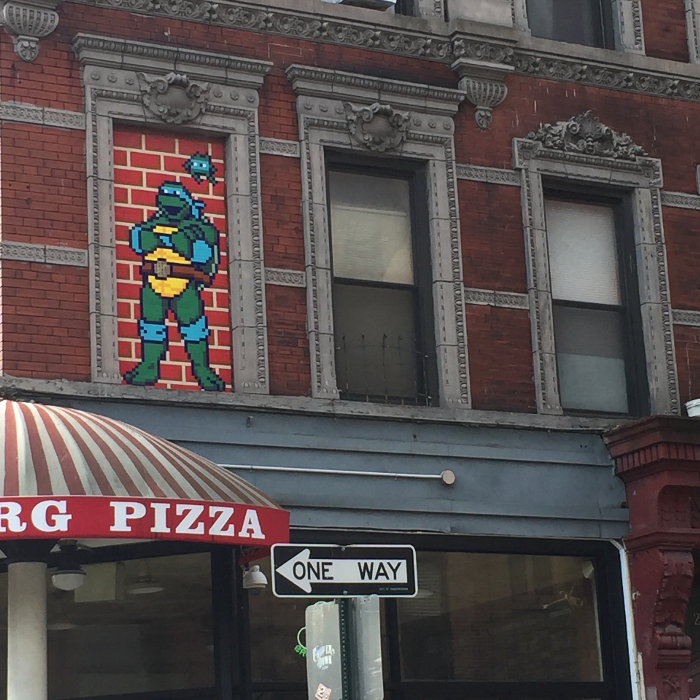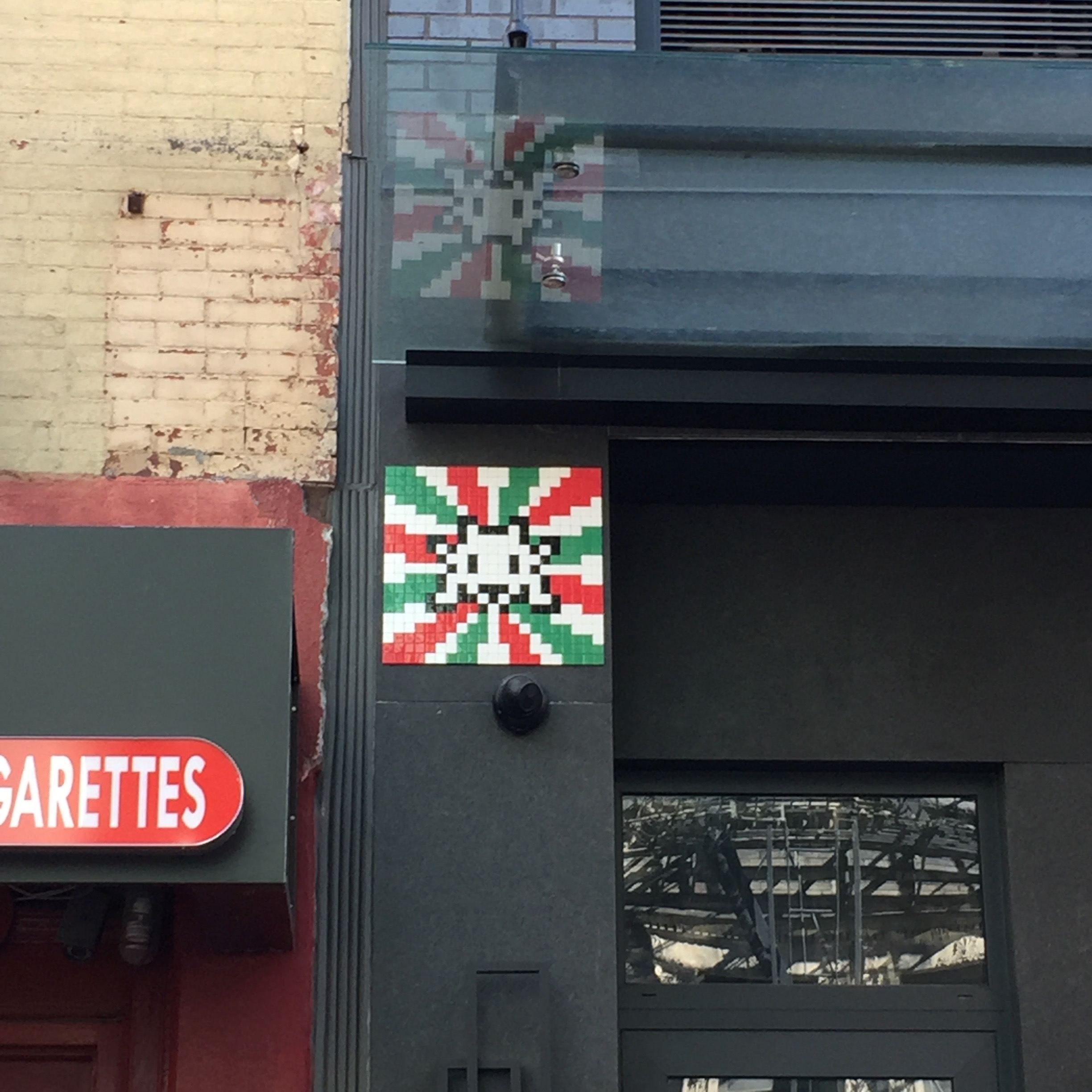 The most interesting is undoubtedly the very last invaders posed at the end of October 2019 in the district of Little Italy. A Ninja Turtle, I don’t know if you remember their fist names, but they were very Italian like Donatello, Michelangelo, Leonardo,… An Invader superhero who loves New York; just like the artist Invader, or a simpler Invader with the Italian Colors: a tribute to Little Italy.
