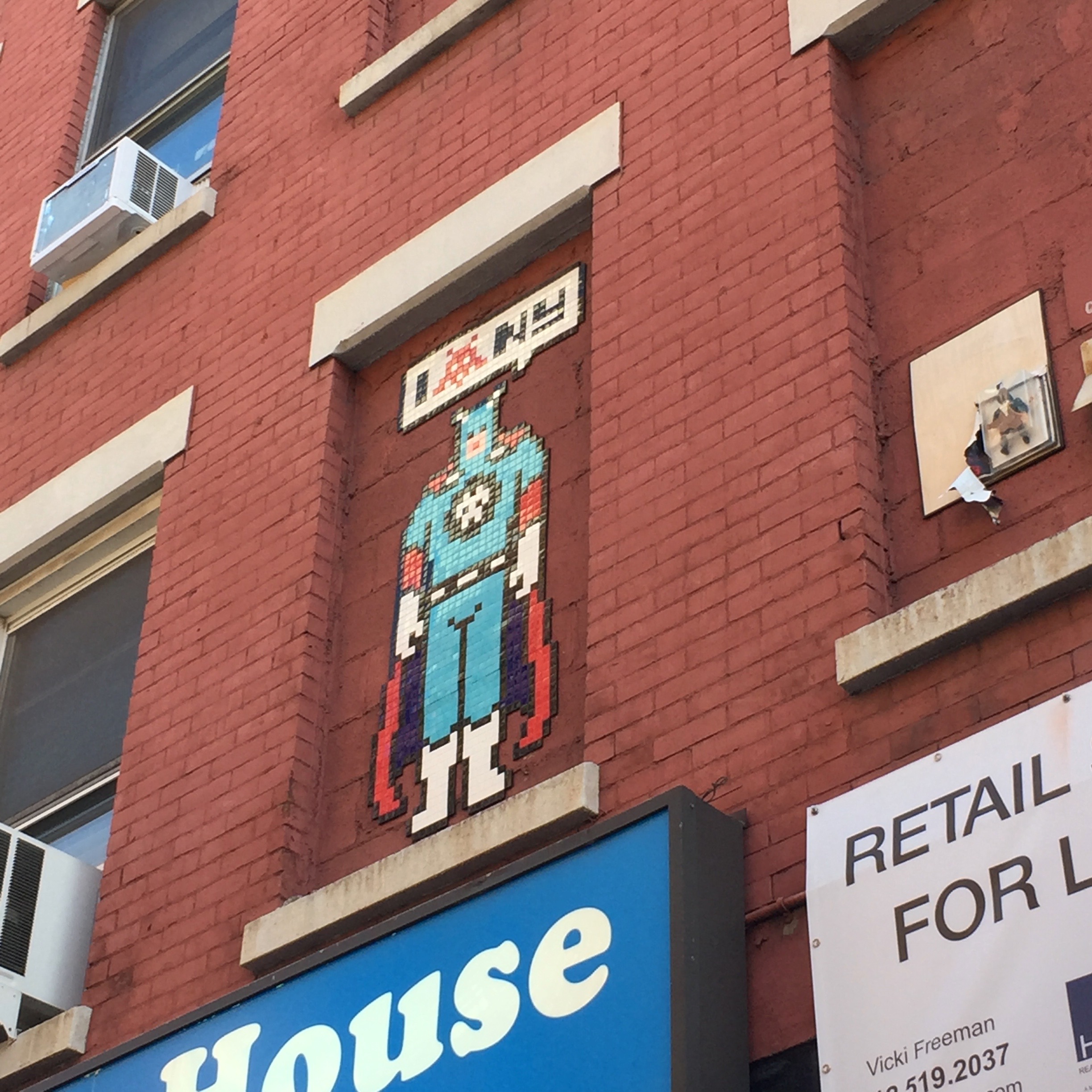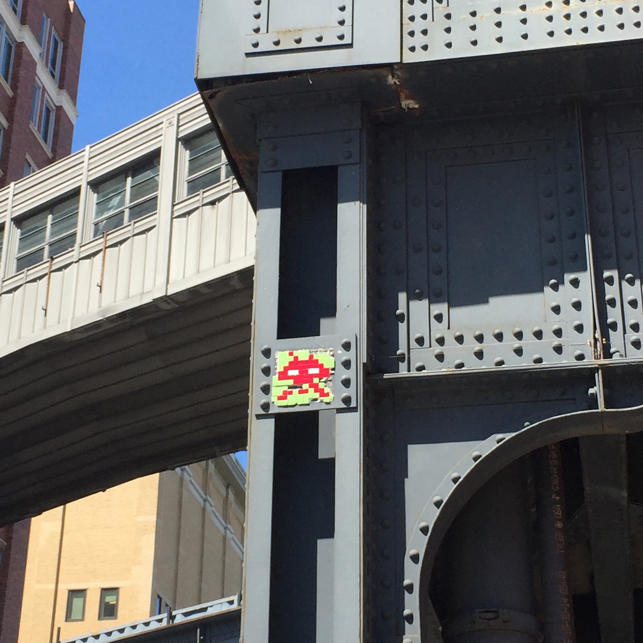 The first time I saw an Invader in New York, it was in Brooklyn when I was reporting on the Bushwick Collective and it was monumental! Nothing to see with those found in Paris! A few days later in the middle of Manhattan, I come across a very very large white invader crunching a red apple! Nice nod to the city. I told myself, that Invader was doing too much like the Americans! But in fact, no. When I was walking around the city I’ve started to see more and more invaders of the usual size : a gay friendly Invader right next to the Statue of Liberty reinterpreted by Eduardo Kobra, another under the High Line (pretty planted promenade along the Hudson River from southeast to northeast of Manhattan), an duo of Invaders named Gemini in The Village, another stuck to the Houston Bowery Wall; mythical Street Art’s wall in the heart of Manhattan, and more recently a rabbit Invader at the exit of the Standard Hotel in the Meatpacking!