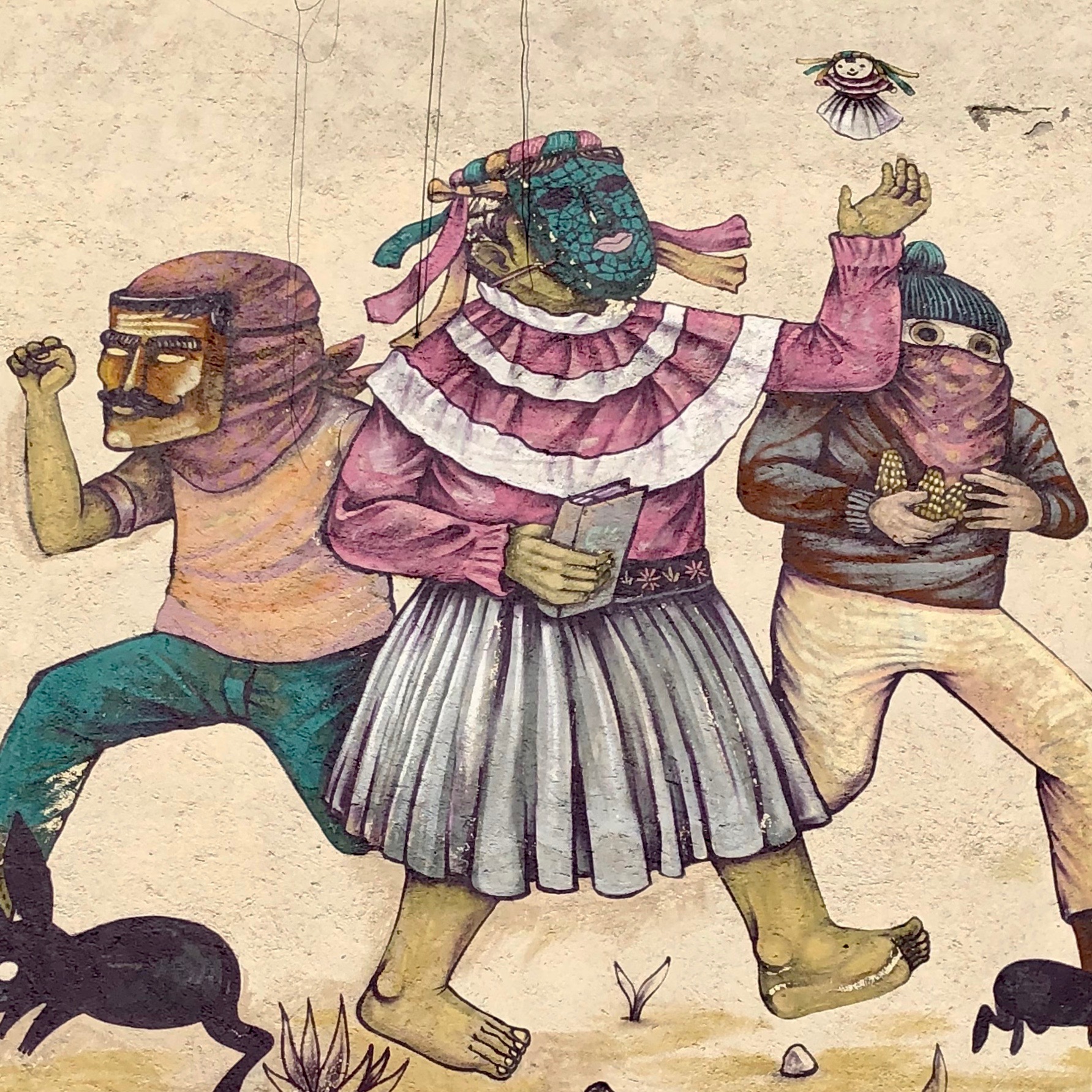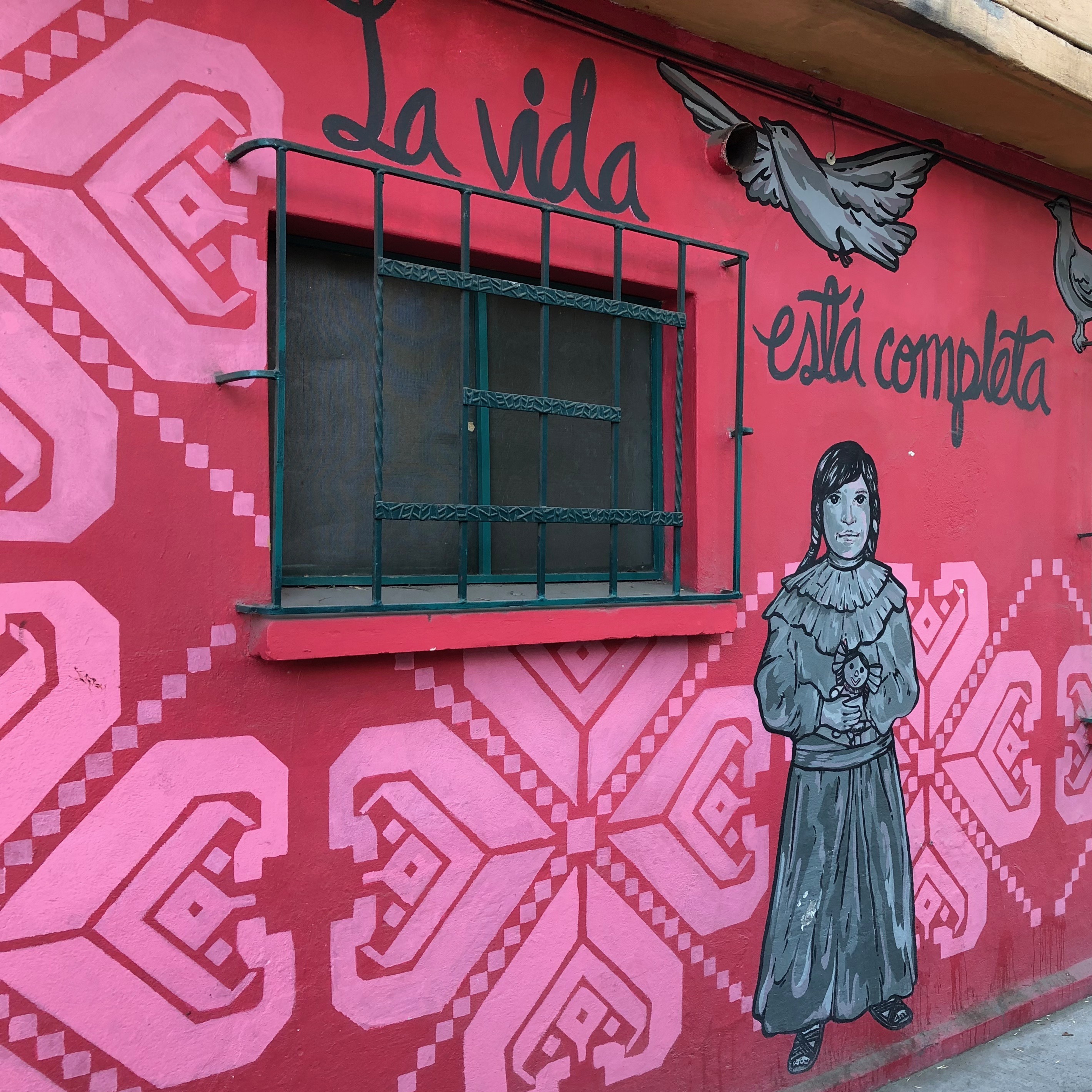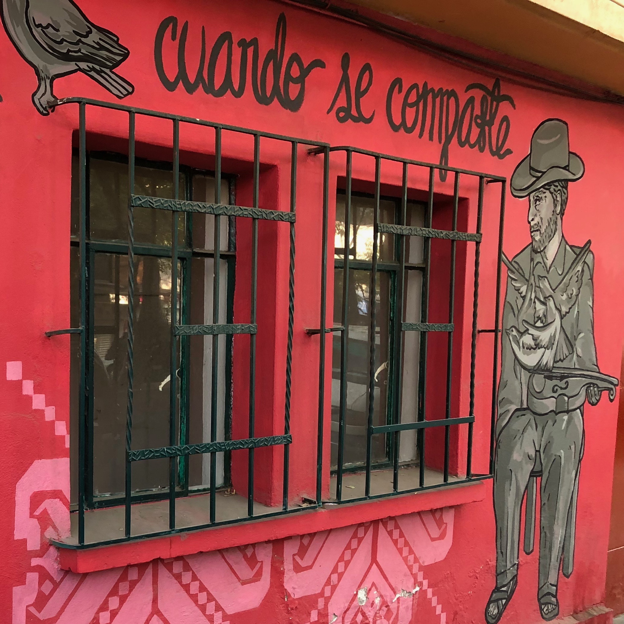 Chauiztle dedicates his work, using modern techniques, to Mexican folk art. We finds there systematically in background, made in stencil, the historical graphics of the indigenous peoples; patterns that are found on homes when traveling to Mexico, just as on their traditional fabrics. These symmetrical motifs come to be enhanced by a face representing a people, a region, … Even if it is not a worldwide recognized artist, his work is very touching and recognizable among all. He used to invite the communities to accompany him in the realization of his frescoes; moreover, the fresco you can see on a pink background has just been made with indigenous communities who settled in Roma Norte. This fresco is a good illustration of tradition and know-how in various fields such as weaving, doll production and violin making. A sentence adorns this fresco: ‘Life is complete when it is shared’, quote that reflects in all simplicity the philosophy of this artist.