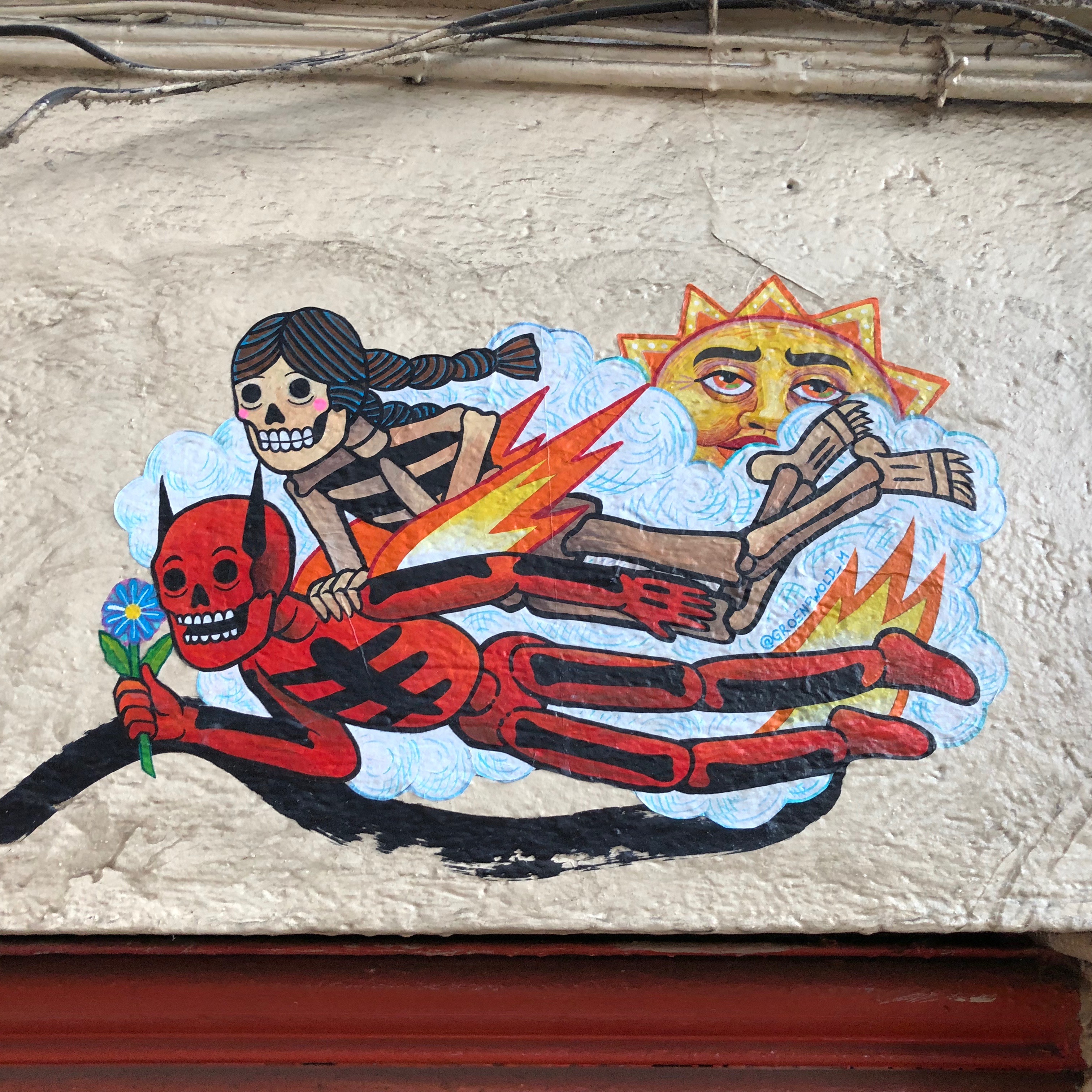 This is the first time that CHA and Elfmilk, two local artists, are tackling a mural. The lines are somewhat coarse because they do not master the technique! What’s more, the context is a bit difficult; this painting is a tribute to rescuers who worked hard after the earthquake of September 2017. But also a monument of hope after this disaster. The name of the work is a reference to Frida Kahlo’s painting, where she had represented herself duplicate in traditional Mexican outfits. On this work the second Frida is in fact the hero of this rescue week; this labrador of the Mexican army managed in a week to locate 52 people of whom 12 were still alive; very quickly its popularity has taken an international scale on social networks. On the right of the fresco we can see fists raised! One could think of a political act; but it is not so! As soon as the rescuers arrived, the Mexicans were all on the street wanting to help get the survivors out of the rubble. Unfortunately the noise swas so important that rescuers could not hear the calls for help. It was then decided that when the rescuers raised their fists, the silence should be done. A simple and powerful gesture that has saved many lives. The center of the fresco is built like a sun that calls for rebirth! A fresco, or rather a monument, which represents a lot for the inhabitants of the neighborhood. With this first work that I presented to you, I imagine that you have already understood that Mexican Street Art is quite far from decorative Street Art!