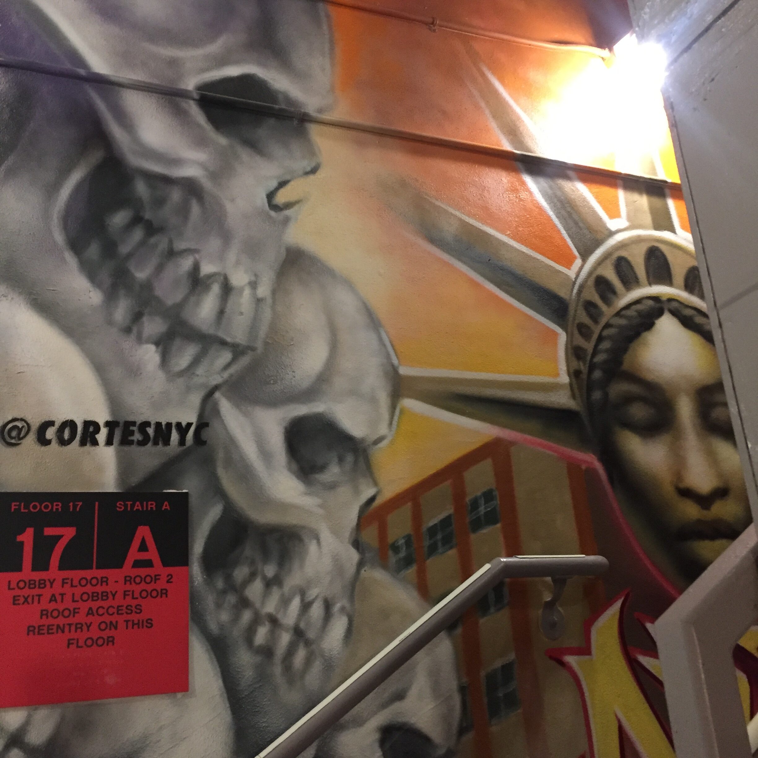It was while visiting the bar, and especially the toilets which have crazy views of East Manhattan and the Brooklyn Bridge, that I spotted a MOSA sticker above the fire escape door! I immediately understood that my steps had led me to this museum, which is not really more than a simple museum; since it is free and it’s actually a stairwell! Suddenly in a frenzy, I opened the door and found myself at the top of this vertiginous stairwell, more than colourful.