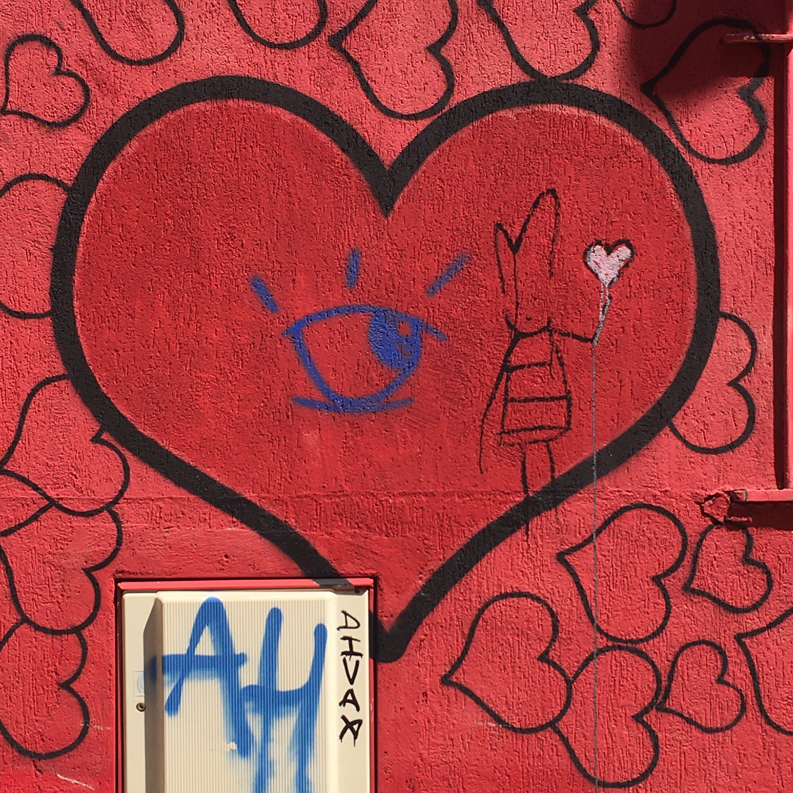 I continue my wanderings towards the south of the city. Still a little perched on the heights, I have to admit that Street Art hides mischievously in the small streets, such as this impressive Minotaur by the artist Bault or this surge of love by the artist Sunra.