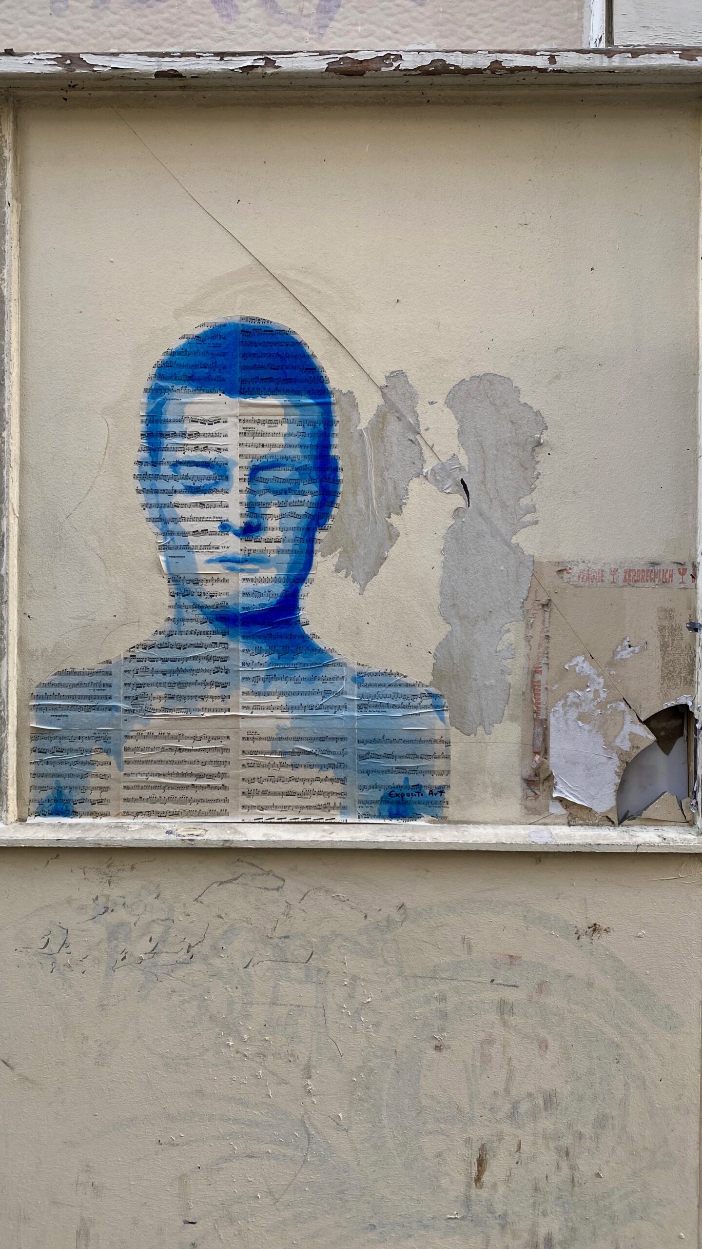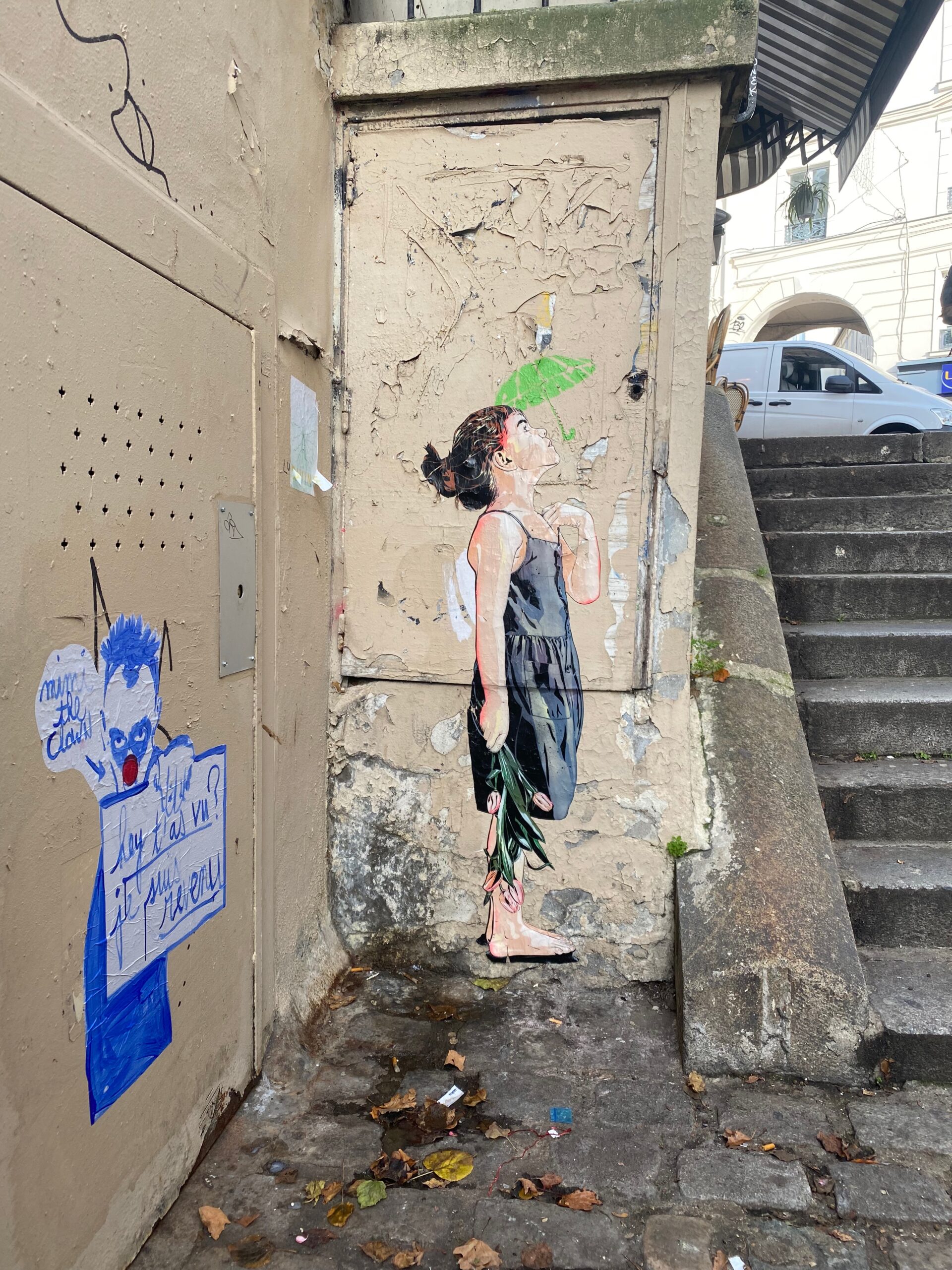 Before considering a climb to the Sacré-Coeur, I wanted to put two portraits side by side. The first, by the Italian artist Exposito, brings a note of lightness and gentleness to this route. The second by the artist Nô is once again a reflection of the neighbourhood. Two faces, two atmospheres that resonate perfectly with the contrasts that Montmartre can offer its inhabitants.