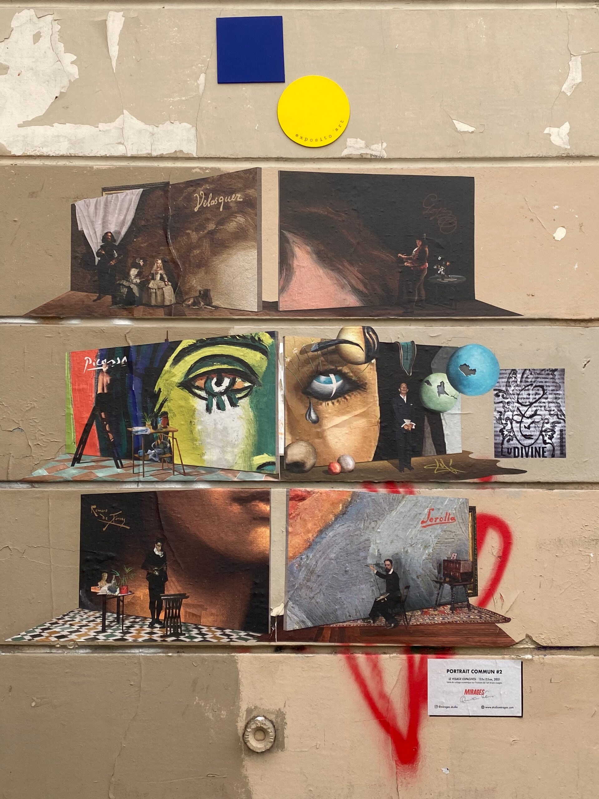 My gaze is drawn to a young woman crouching down. Her attitude seems resigned, absent and almost chilling. I approach and read the small label under the collage “Portrait.2, #gardiennederue… or how to reintroduce women in the city”. The artist’s name is LaDame_QUICOLLE and after this first discovery I’m going to take a closer look at her work!
