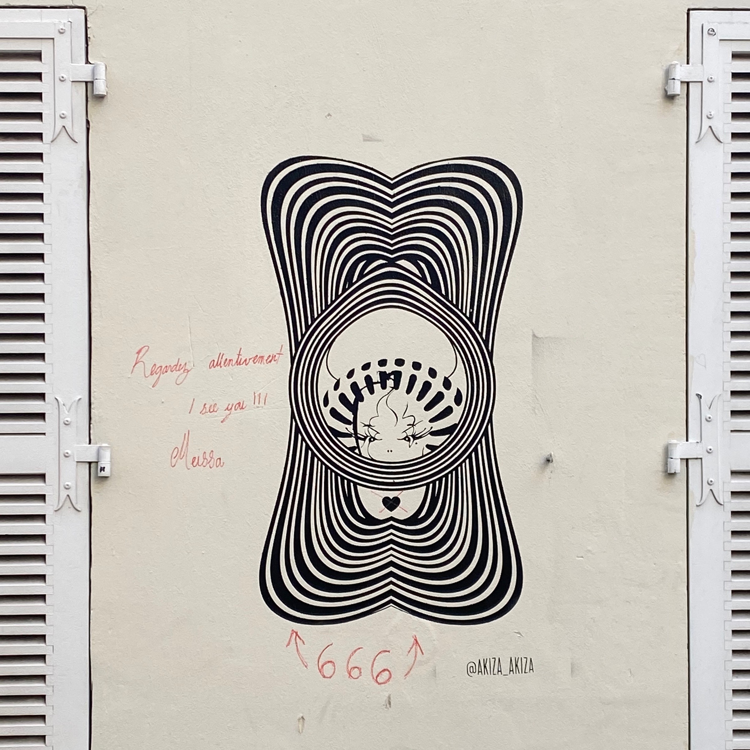If you go back to rue Lepic for a few metres you arrive at rue Véron. This street used to be the one with the most eclectic nightlife in the area, you could eat Capitaine en papillote with your fingers in an African restaurant; a Spanish woman was making Tapas so slowly that the whole restaurant was laughing with the sangria at midnight without having had dinner,… It was a joyful chaos that has become much smoother… Luckily urban artists have taken up residence in this street which is a bit sheltered from the effervescent Butte! Just a few weeks ago you could see the work of South African artist FAITH XLVII, which was simply magnificent. I couldn’t help but use it on the cover of this article, as its erasure pinched my heart a bit. This wall has probably been taken over by the association Le MUR and thus becomes Le Mur Montmartre, on which a very graphic work with some anamorphic accents by Marchal Shaka takes pride of place. This work will probably be covered by another one in a few weeks!