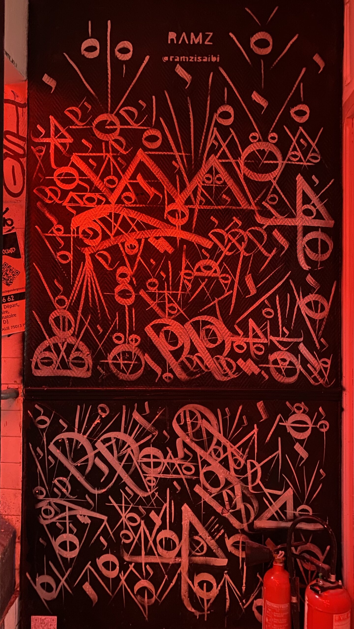 The artist demoisellemm took up the torch and initially five artists took over the site. Then the situation evolved and 25 artists occupied the space in its every corner. Even before entering the premises, the tone is set. The “characters” of dbry92 on the left, the first crew to have taken over the space, answer to the new team of 25! L’Empreinte Jo V, Raf Urban, Les Poulpeuses, Trassh, Joko, Fé tavie,… have signed in their own way the tiles which are the embrasure on this strange hotel door. Once past the entrance, it’s a real explosion for the eyes; Joko‘s comic book-style drawings meet RamZ‘s dancing calligraphy. Not a single space is free of paintings. As you enter what is the Globe Café you immediately notice an iconic character from L’Empreinte Jo V . The atmosphere is chaotic and this teddy bear abandoned next to the beer barrels bathed in red light almost makes us think of an old Pigalle tripot!