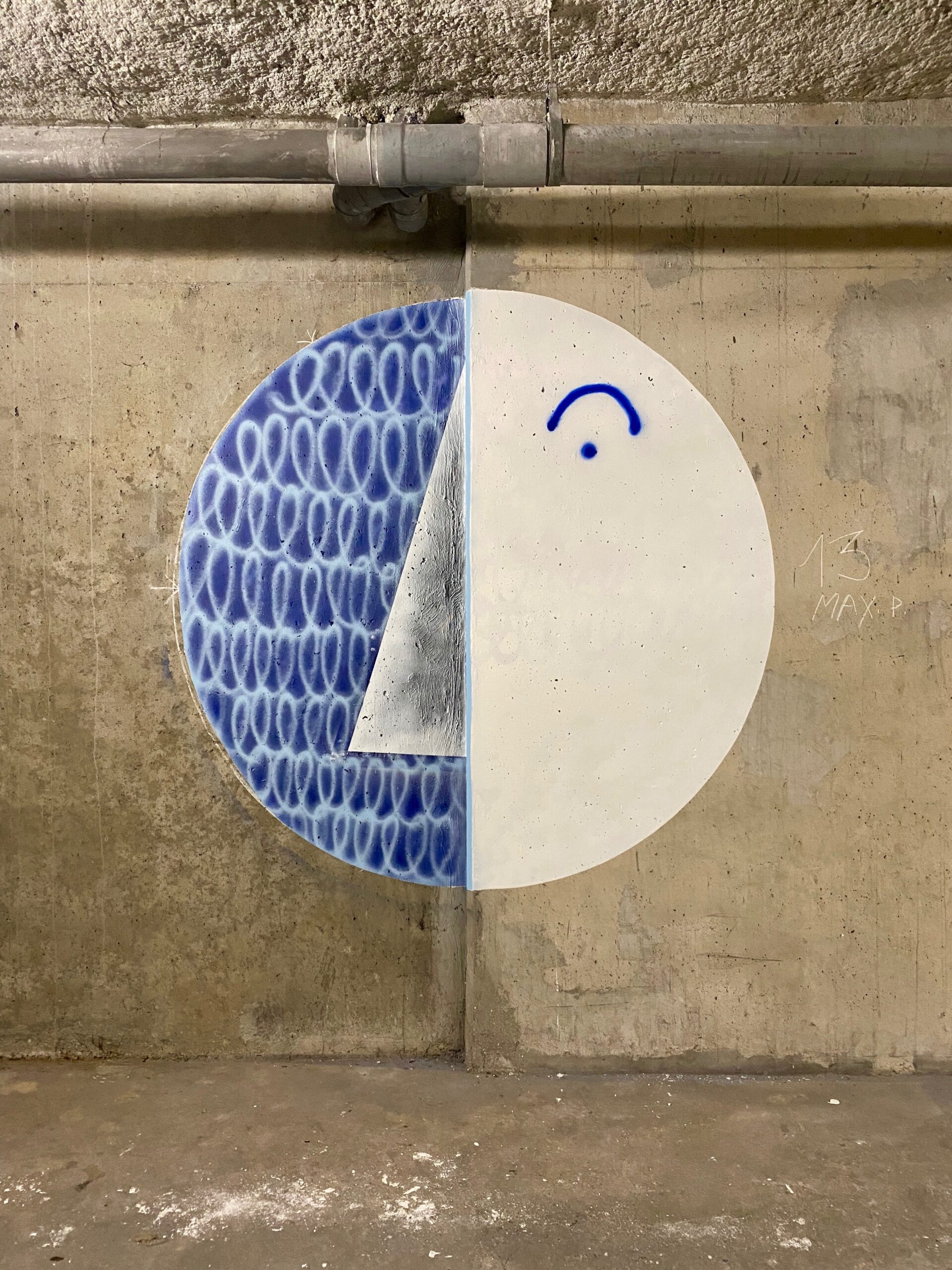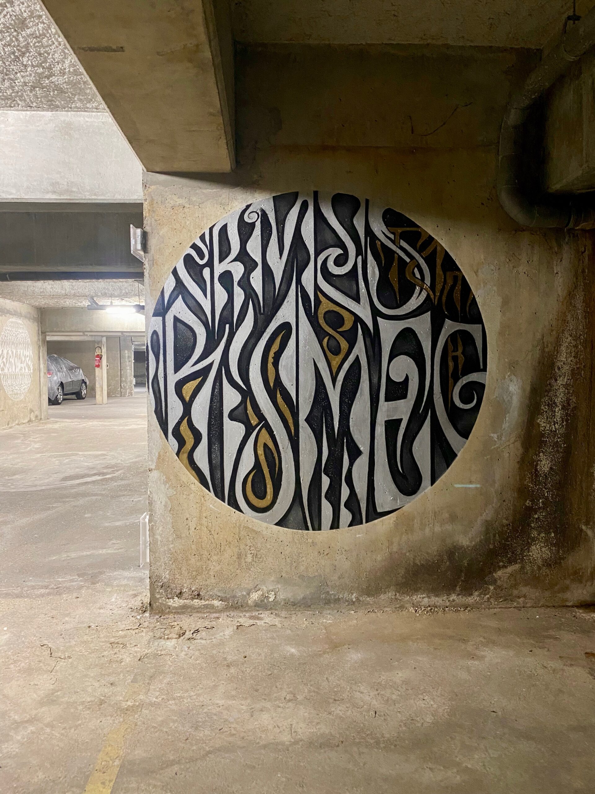 Have you ever been in an empty car park? Personally it was the first time for me! No noise, no more smell of petrol or oil, a kind of “zenitude” in a place that many find disturbing at night. Once welcomed by Ojan‘s circles, the descent into the Car Park begins; and I can see Apôtre‘s automatic writing on my right. I realise that I am walking around like a car avoiding parked cars… I continue my visit as the conditioned human being that I am, with this strange sensation of discovering works through a spyglass!