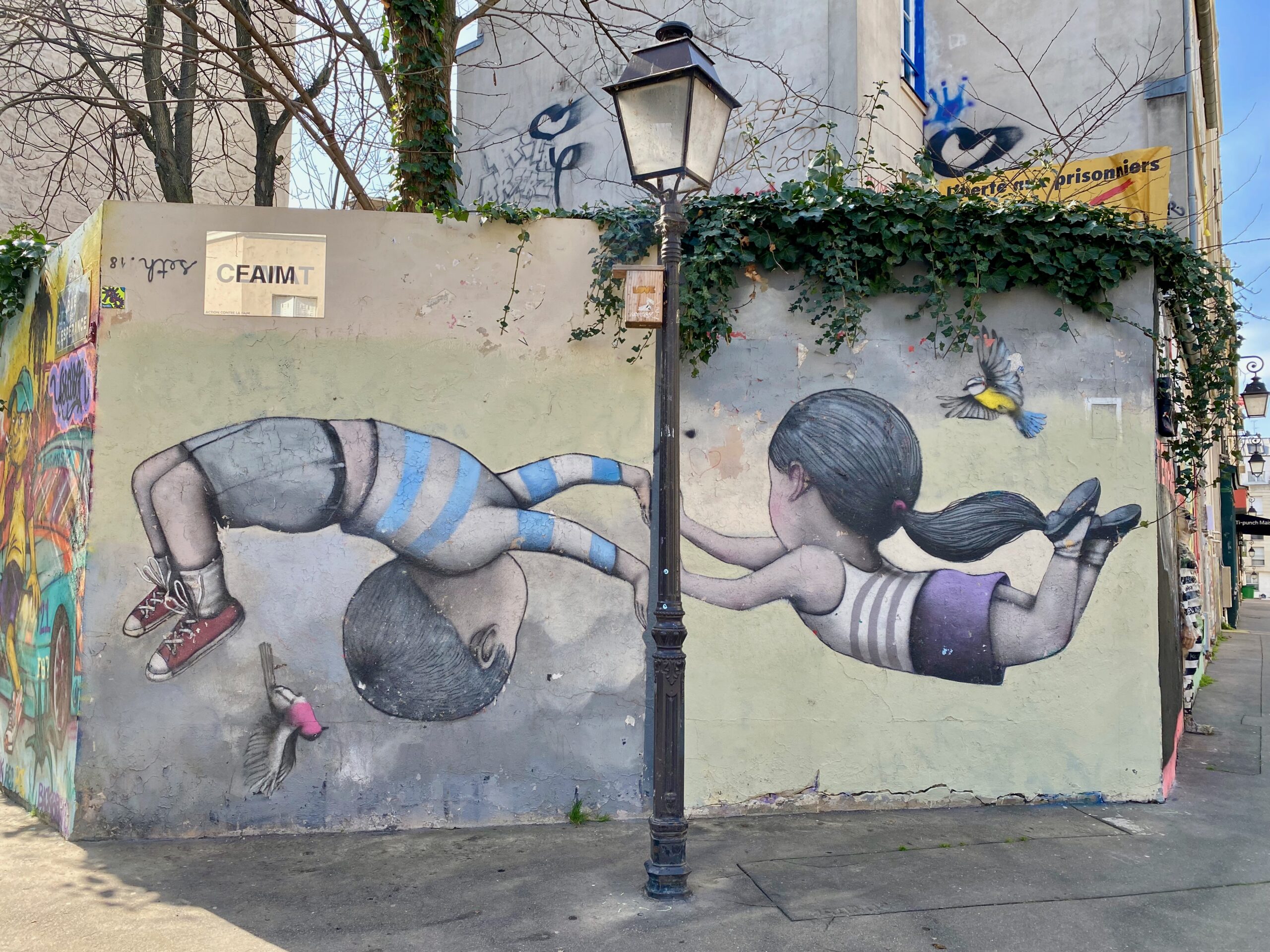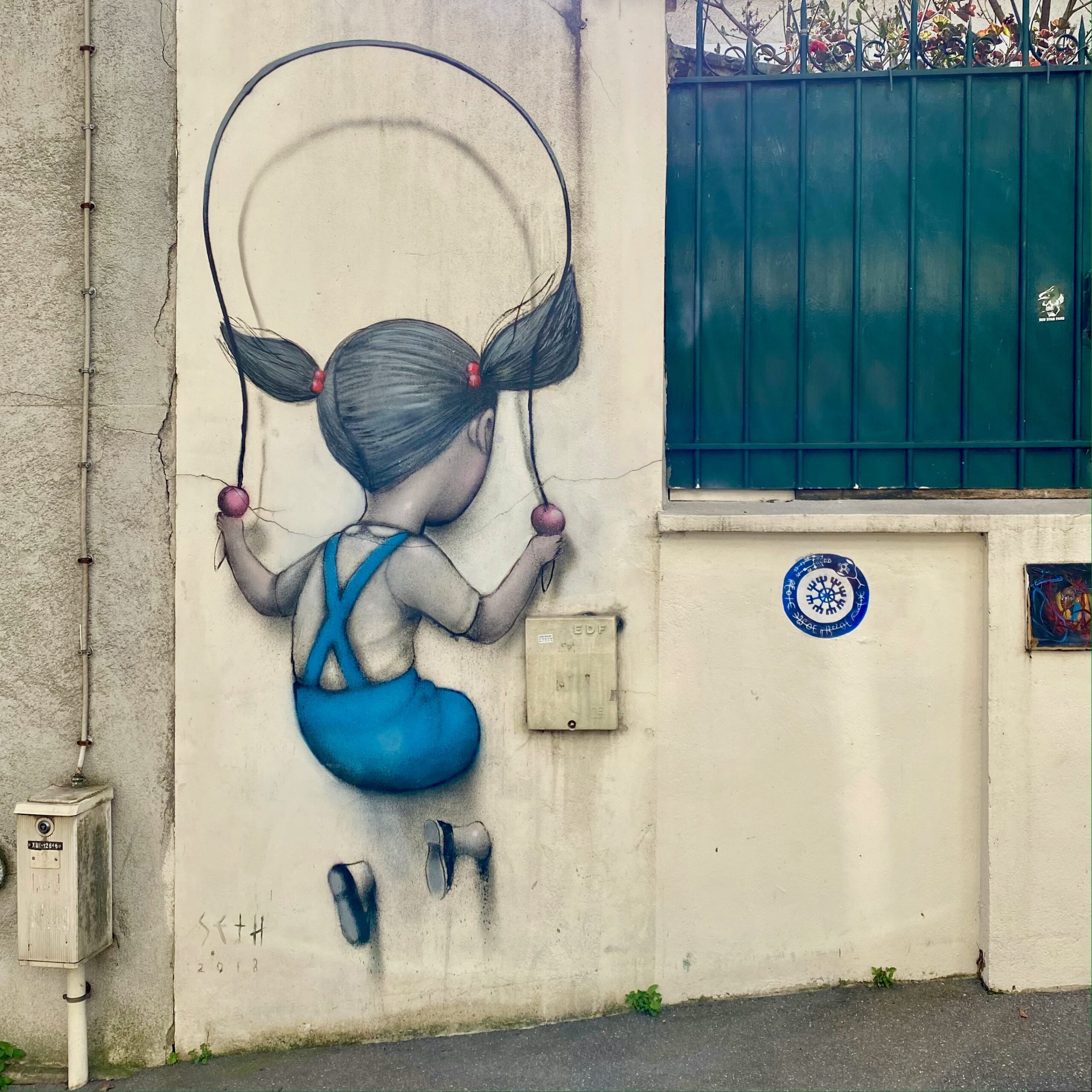 How could I not present Seth‘s work in this article! Honestly, it would be indecent to talk about Street Art in the Butte aux Cailles without mentioning the incredible number of works he offers us to see. Moreover, his works representing children playing fit perfectly with the morphology of the place and we can easily imagine children having fun in these winding streets. I won’t dwell on the work of this artist, whom I have already introduced to you many times, but just share with you some of his works on the Butte 😉