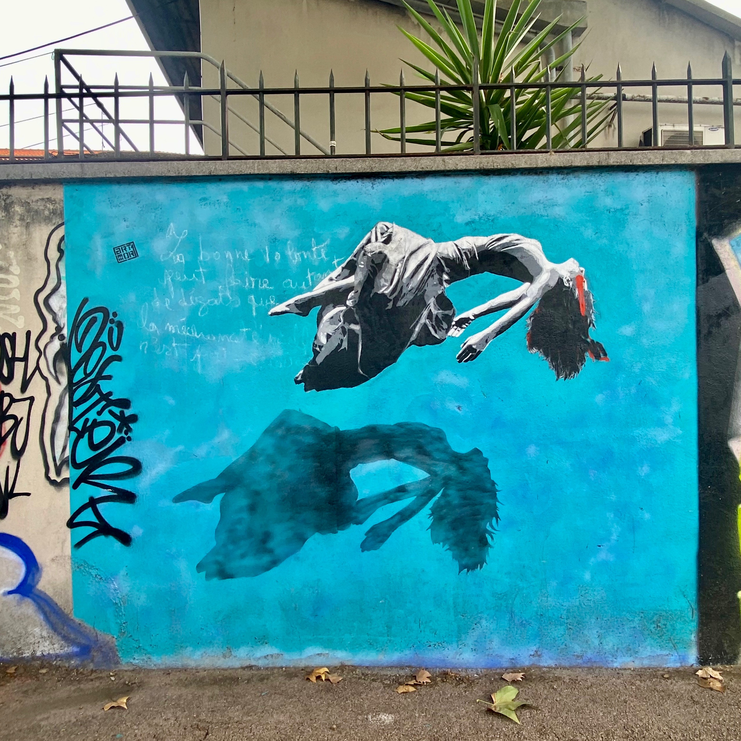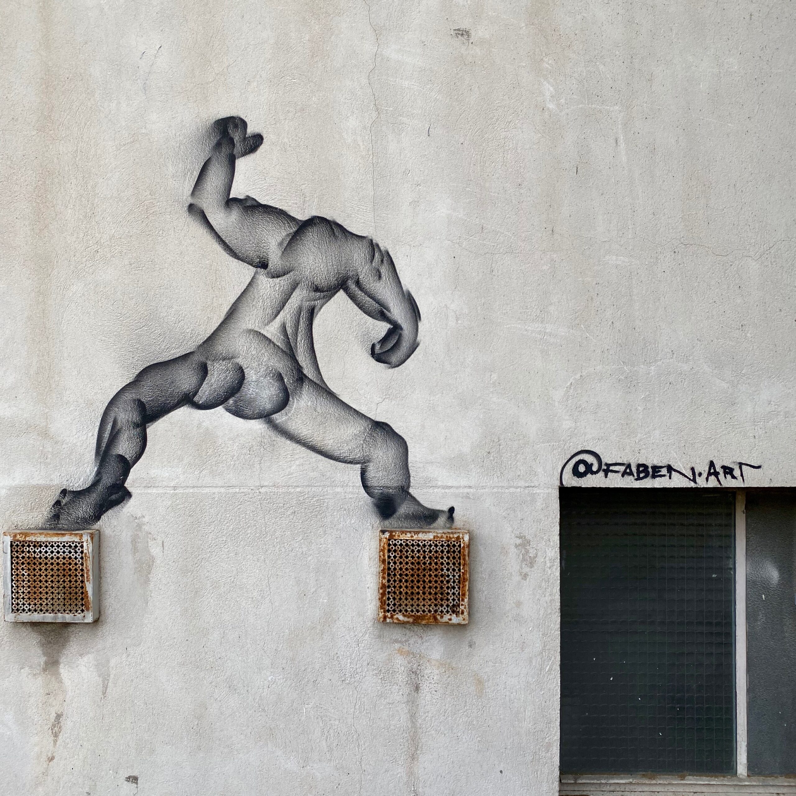The third work is by far my favourite. It has that extra “je ne sais quoi” that belongs to urban artists who play with architecture with intelligence. This kiss, made impossible by the nature of the building, reinforces the desire of these two embracing beings / statues. The tension is palpable, and we tend to remain captivated by this artistic and architectural rendering. Called “Lovely tension“, this work made me realise that César Malfi‘s work was evolving, undergoing reflection, and that he would continue to move forward without resting on his Nice laurels. This is reassuring, because fame, even regional fame, can sometimes get the better of creativity. I can’t wait to see how he confronts other worlds: Brooklyn, London, Athens… To see him leave his comfort zone and confront his thoughts with other architectures… A very, very nice encounter! An artist to watch!