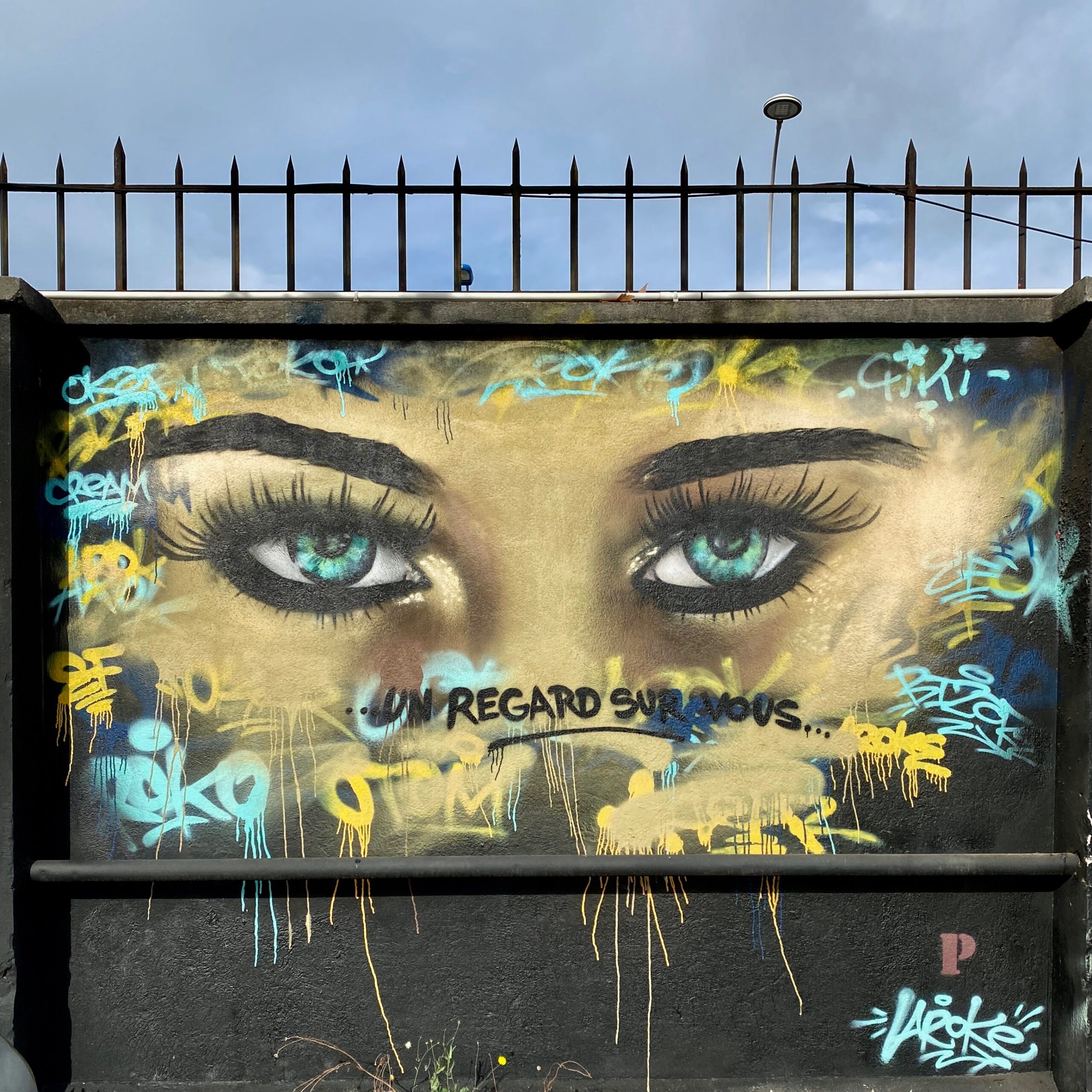 So it was with curiosity that we continued our walk with Andy, discovering the first free expression wall, which is none other than the outside perimeter wall of 109. I was amazed to discover 4 portraits! The first one blew me away, because yes, Jean Rooble is the great specialist in hyperrealism in France… and we’re often used to attributing this movement to the Americans, who reproduce beautiful photos wonderfully with a brush. But Jean Rooble comes from a graffiti, lettering and wild style background, and he works exclusively with spray paint… What he brings to hyperrealism is a palpable touch of humanity… with each work we are discovering new feelings. This face from a photograph by Ken Wongyoukhong was like a new punch for me. It’s a striking work that I didn’t expect to see in the streets of clean-cut Nice. What a show!