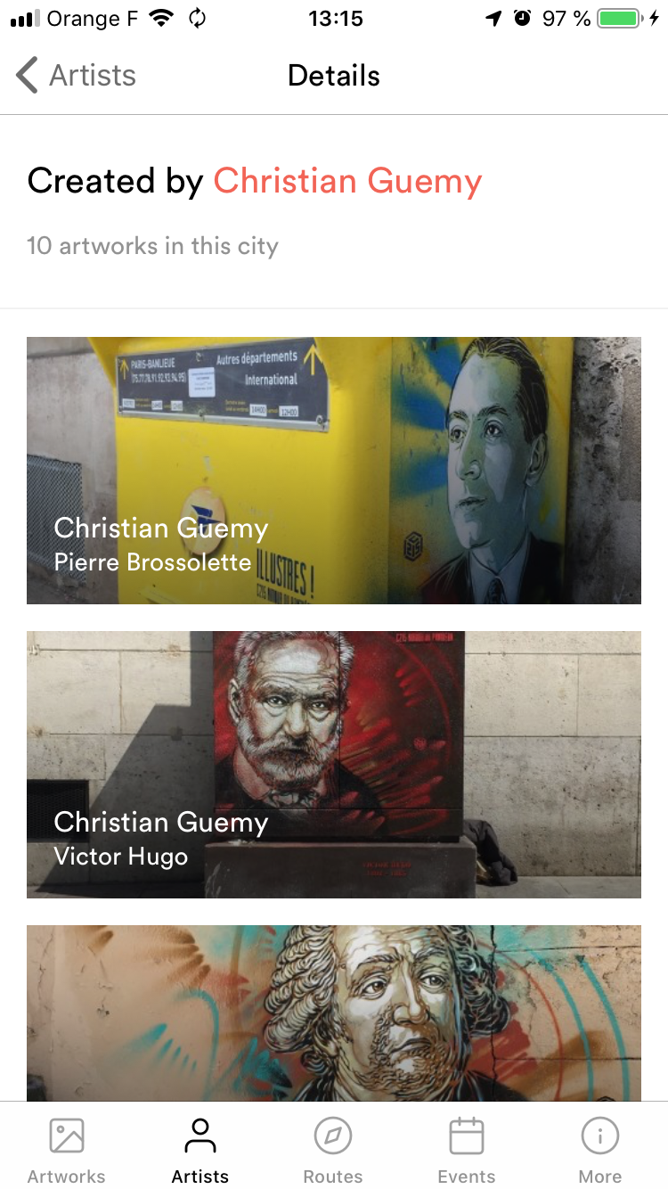 Si vous êtes un passionné, vous voudrez certainement découvrir directement les œuvres des artistes que vous appréciez, comme par exemple Christian Guémy Alias C215 à Paris. Rien de plus simple, Vous cliquez sur l’icône « Artists » en bas à gauche ; la liste des artistes de la ville apparait, vous cliquez sur l’artiste de votre choix et toutes les œuvres qui y ont été chassées sont cataloguées. Ensuite, vous cliquez sur l’œuvre de votre choix et vous disposerez de toutes les infos sur celle-ci tout comme sur sa localisation. Si vous souhaitez directement aller voir cette œuvre rien de plus simple, vous cliquez sur « Navigate » et décidez comment vous y rendre.