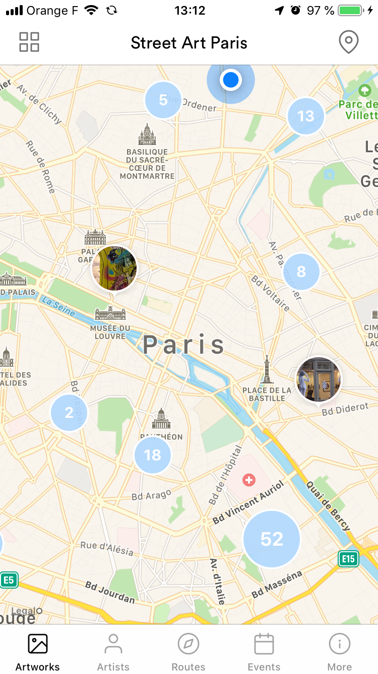 Une fois l’App ouverte, vous sélectionnez la ville où vous êtes et l’App vous indique où sont localisées les œuvres par rapport à votre position ; cela reprend toute la simplicité de Google Maps. Si vous voulez préparer un voyage, vous pouvez aller voir ce que vous pourrez trouver comme Street Art dans d’autres villes comme New-York, Berlin ou autre.