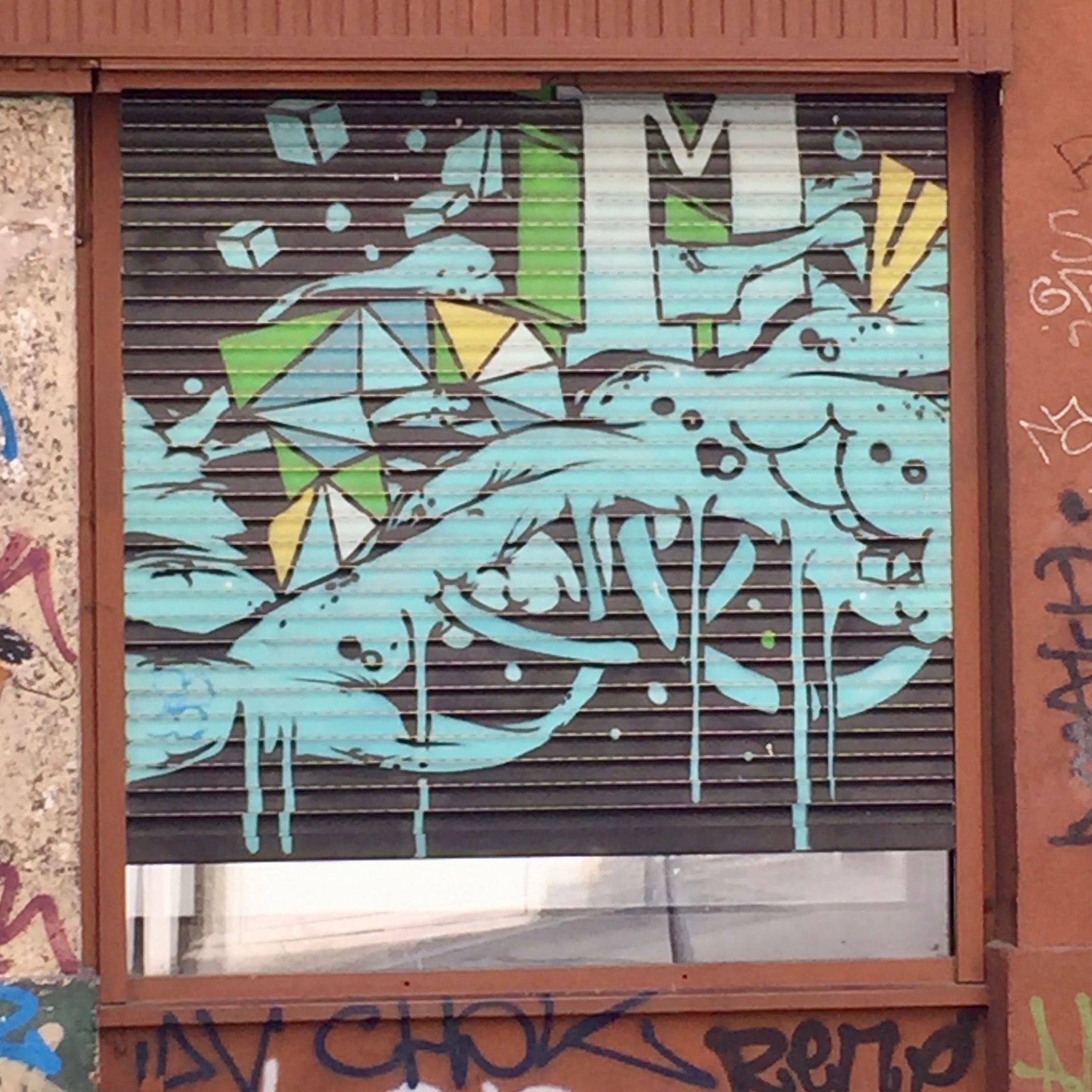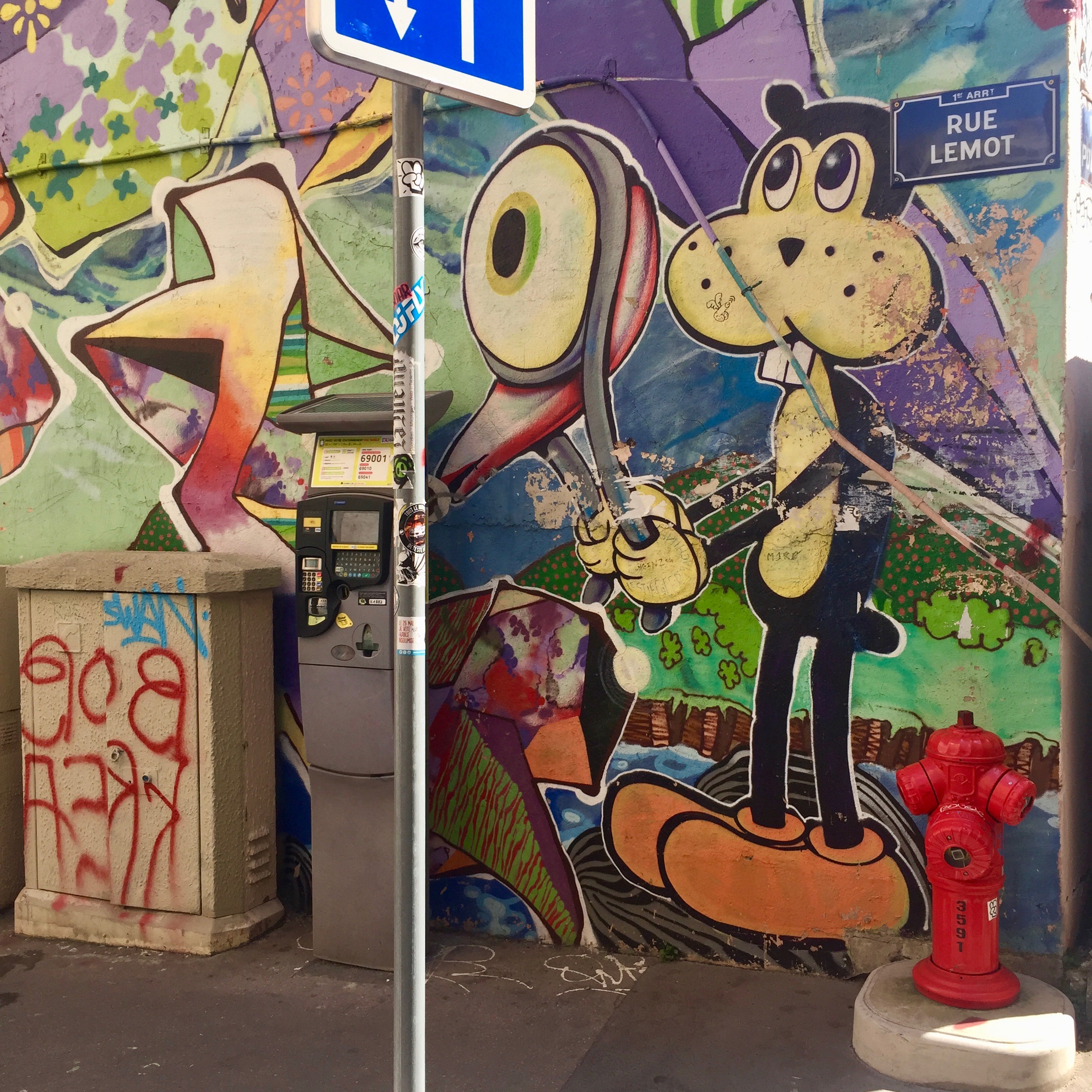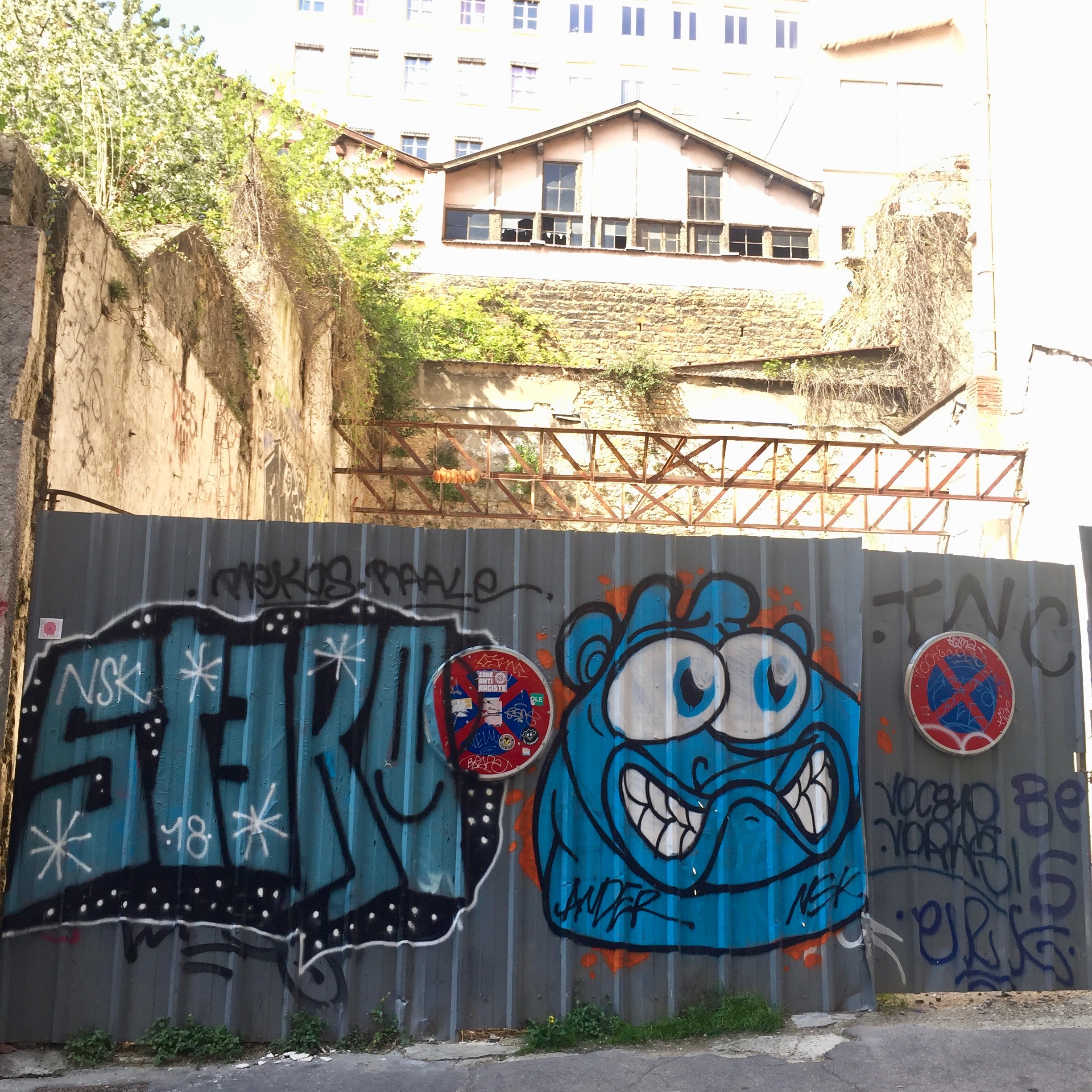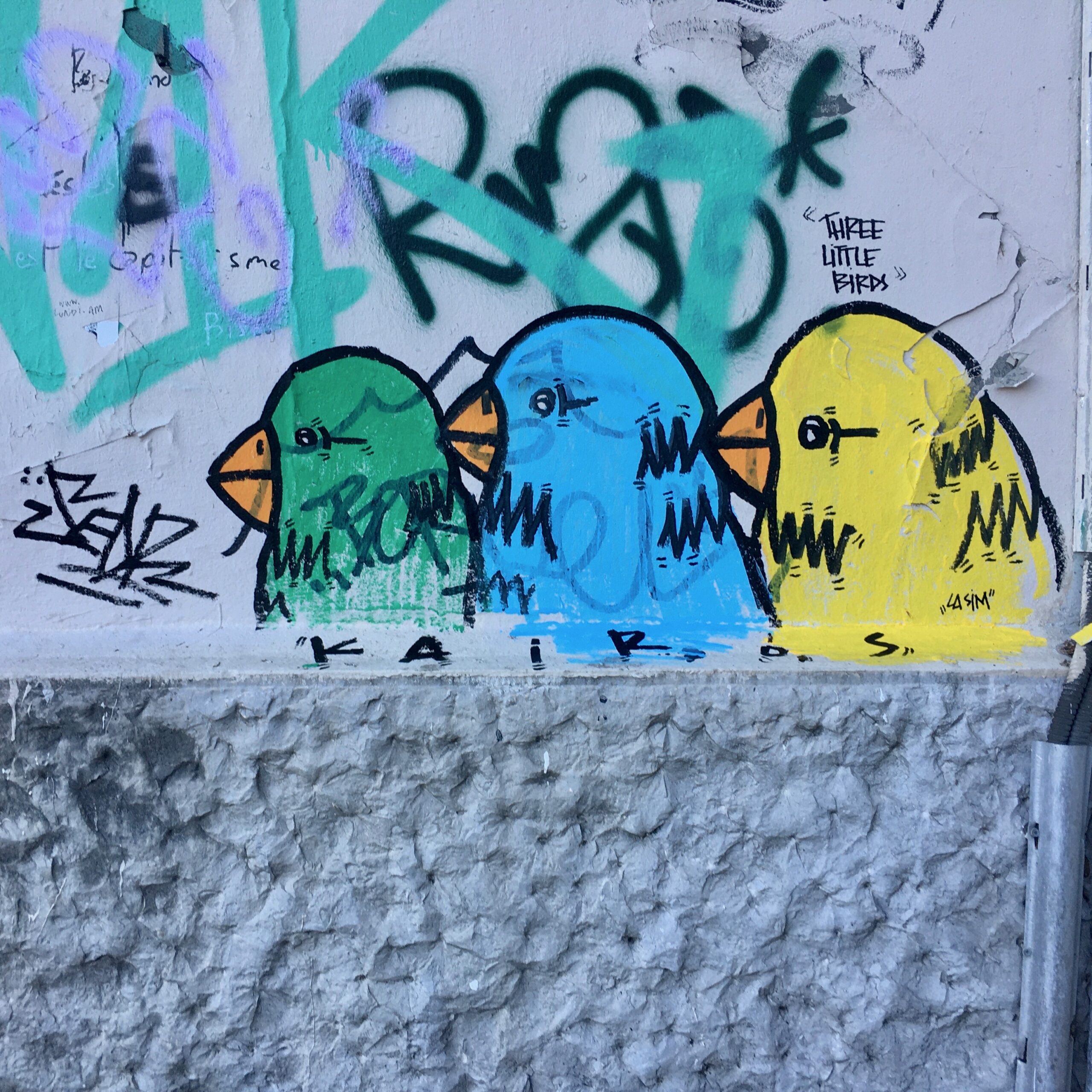 J’ai quand même réussi à reconnaître quelques Blaze et repérer quelques artistes que je connaissais après avoir pris des centaines de photos ; par exemple on retrouve GRIS1, STERO avec son Blaze très carré, souvent accompagné d’un monstre bleu. Pour STERO c’est assez facile car on retrouve son personnage partout en France et dans toutes les couleurs ! Mais au détour d’une rue, vous pouvez tomber sur les animaux préhistoriques de Lasco ou encore les « Three Little Birds » de Kairos.