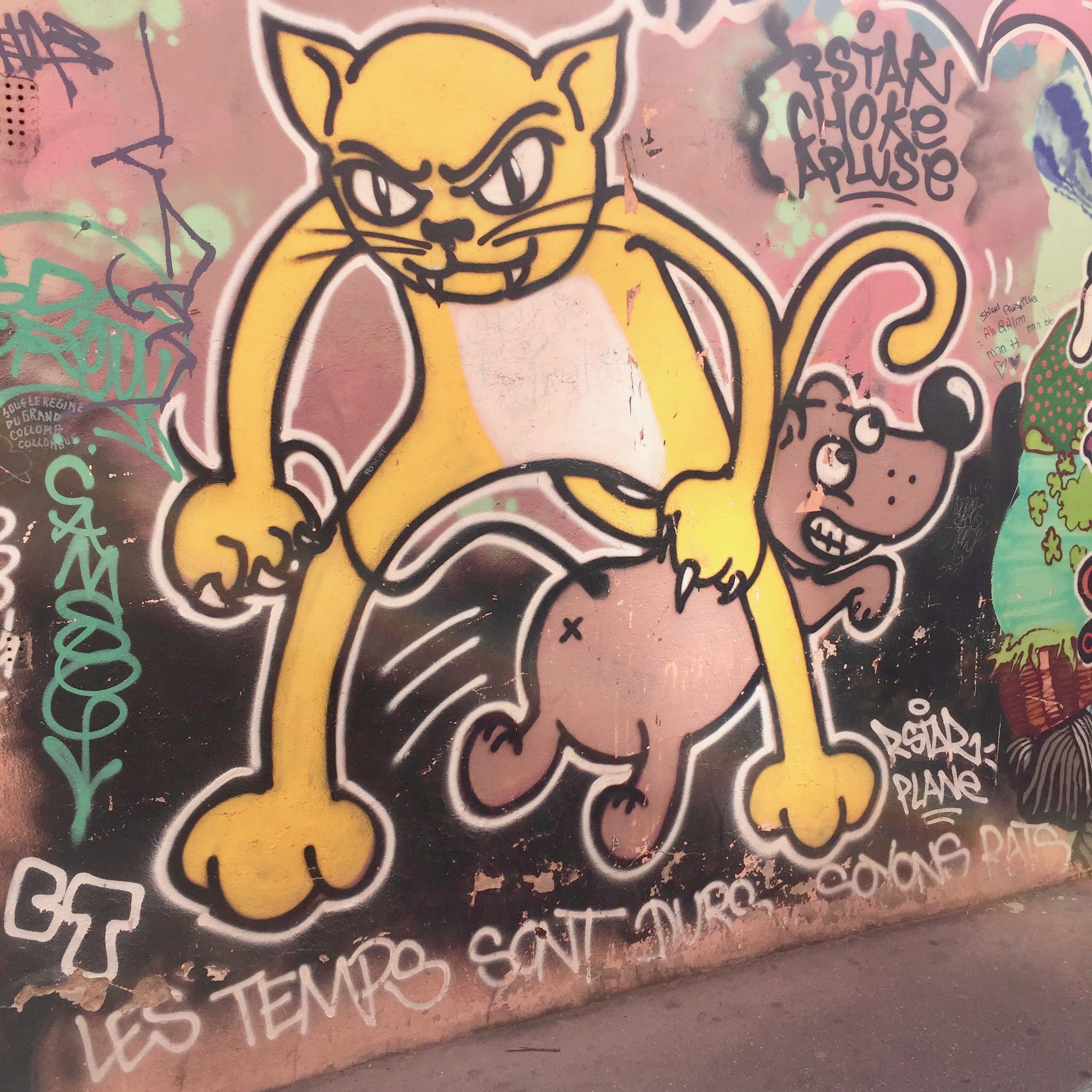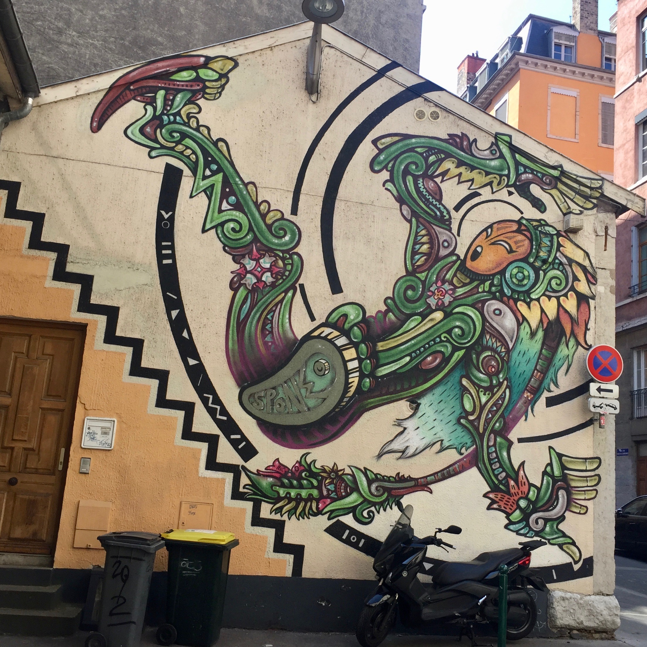 C’est certainement une des rues les moins fréquentées de Lyon ; mais on y trouve un concentré de Street Art. Entre l’ancienne fresque « Gainsbourg » réalisée par Yandy Graffer, qui est dans les escaliers et quasiment impossible à prendre en photo par manque de recul ; le travail de SPONE avec ses personnages si particuliers et les fresques des restaurants et cabarets ; la rue des Tables Claudiennes est incontournable pour qui cherche du Street Art à Lyon ! Sans parler de tous les collages & autres graffitis que vous trouverez dans cette rue.