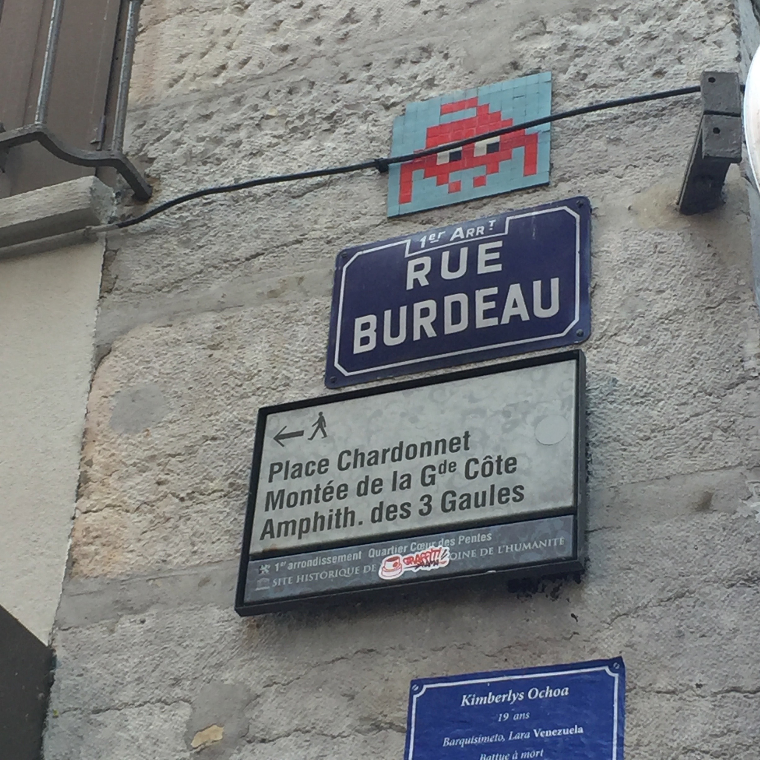Bien évidemment, vous tomberez sur des Invaders; car il y en a maintenant partout dans le monde et Lyon ne fait pas exception à la règle. Et forcément vous tomberez sur les roses & cœurs, tels des tatoos de l’artiste Georges de Loup ; car il refait une œuvre dès que la Mairie lui en supprime une ! et le plein d’autres petites installations urbaines que j’ai posté sur mon Instagram!