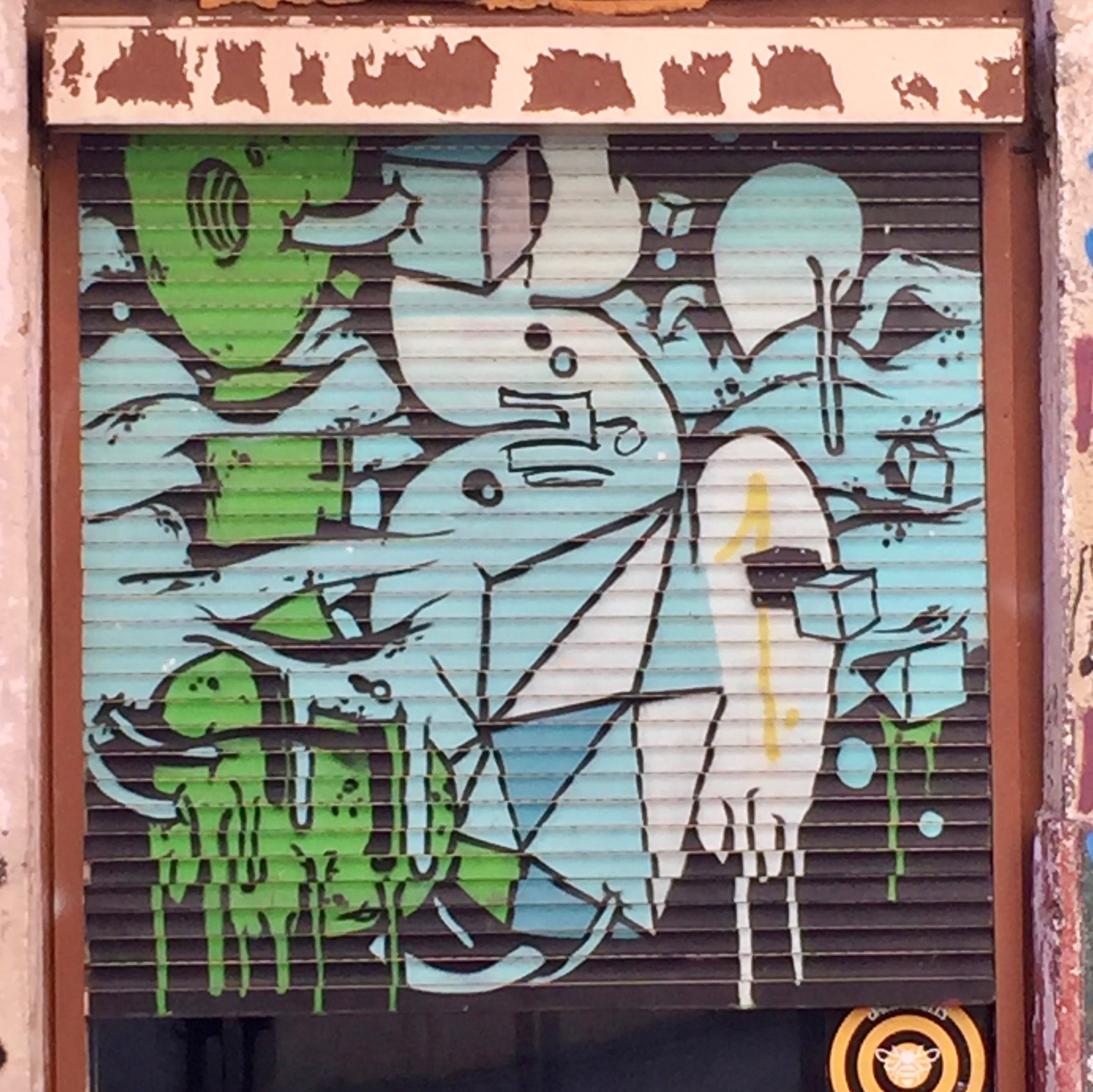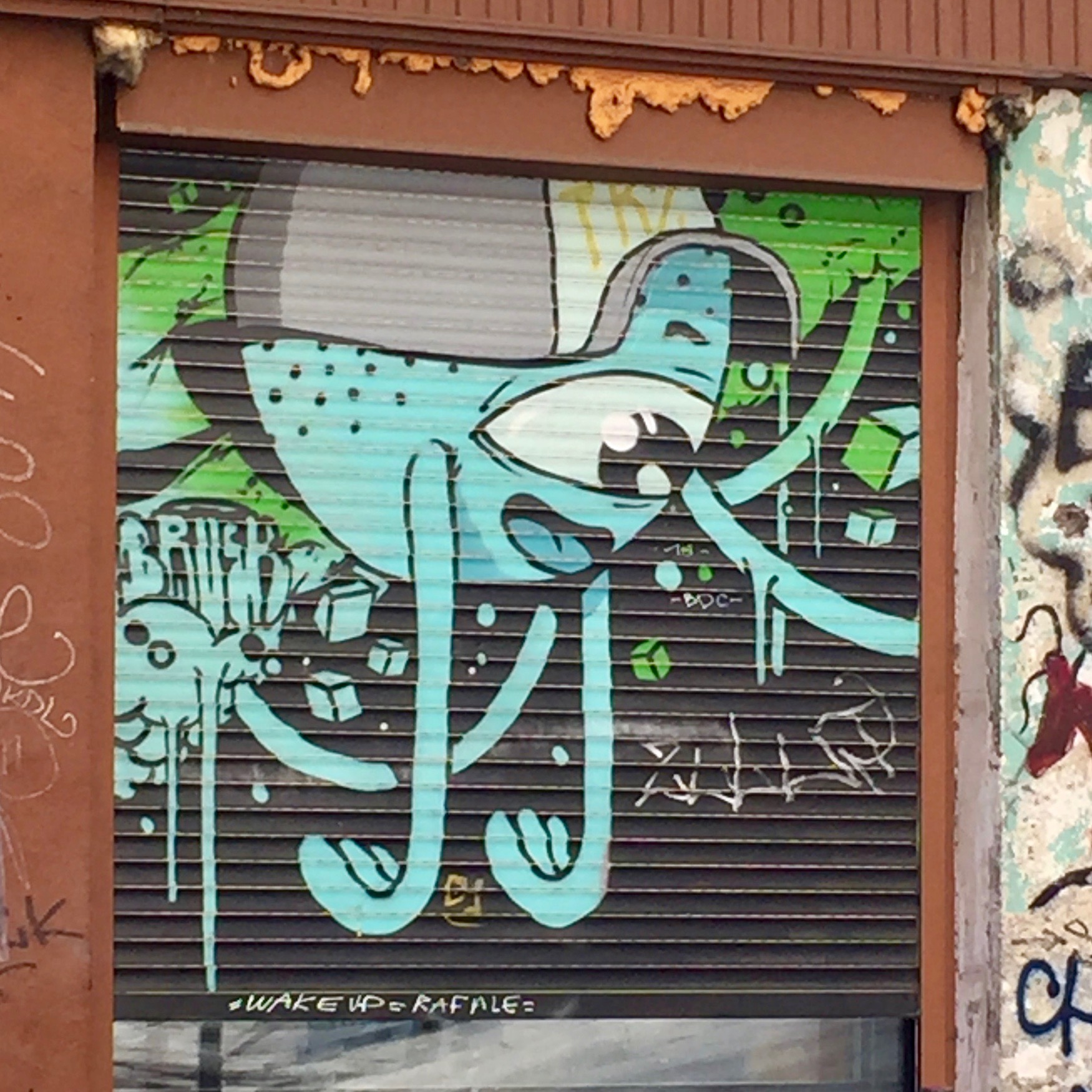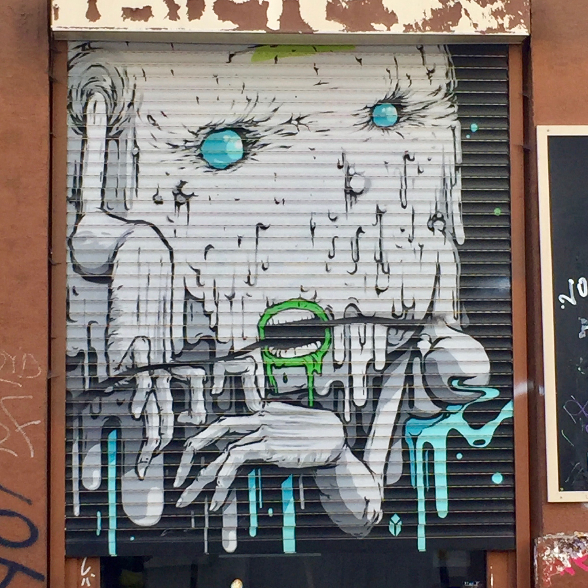 Un autre artiste qui a laissé son empreinte sur les pentes de la Croix-Rousse est Brusk. Originaire de Saint-Priest en région Lyonnaise, cet artiste est connu internationalement et son style est facilement reconnaissable puisqu’il est adepte du style « dripping ». Même si bon nombre de ses œuvres ont été enlevées par la Mairie ; on retrouve une très belle enfilade de monstres –peut-être aquatiques – montée des Carmélites.
