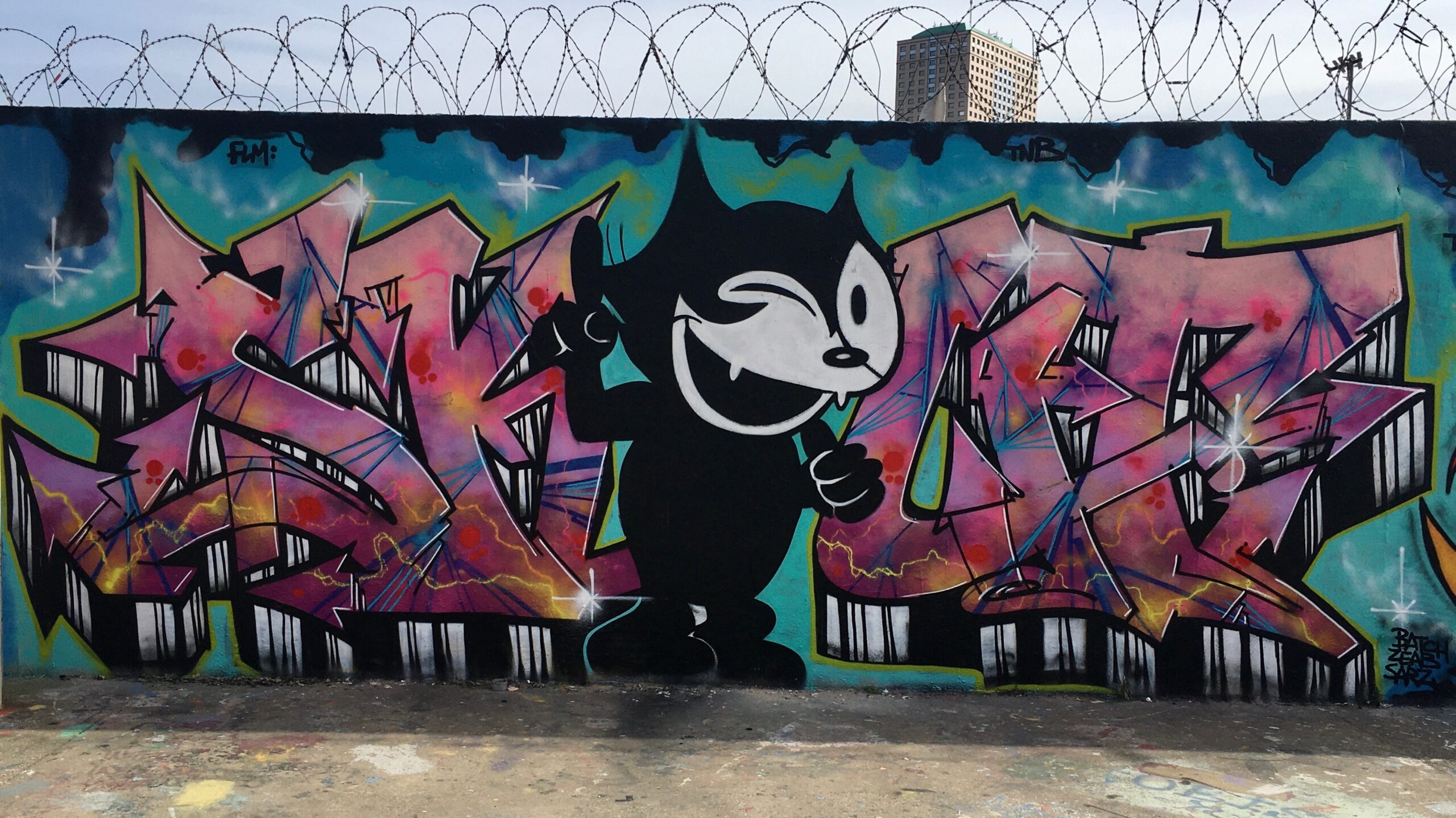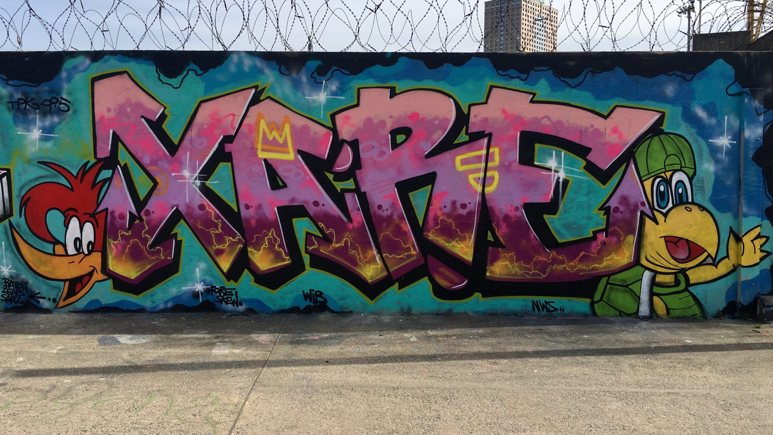 Le mur qui fait face à ces œuvres XXL est lui aussi graffé de toute part, on y retrouve le monde du graffiti sous toutes ses formes, Bubble Letters, Block Letters, et beaucoup de graff’ d’inspiration Américaine… Certes les artistes sont peut-être moins connus mais méritent que l’on s’attarde sur leurs Blazes ou quelques essais plus complexes.