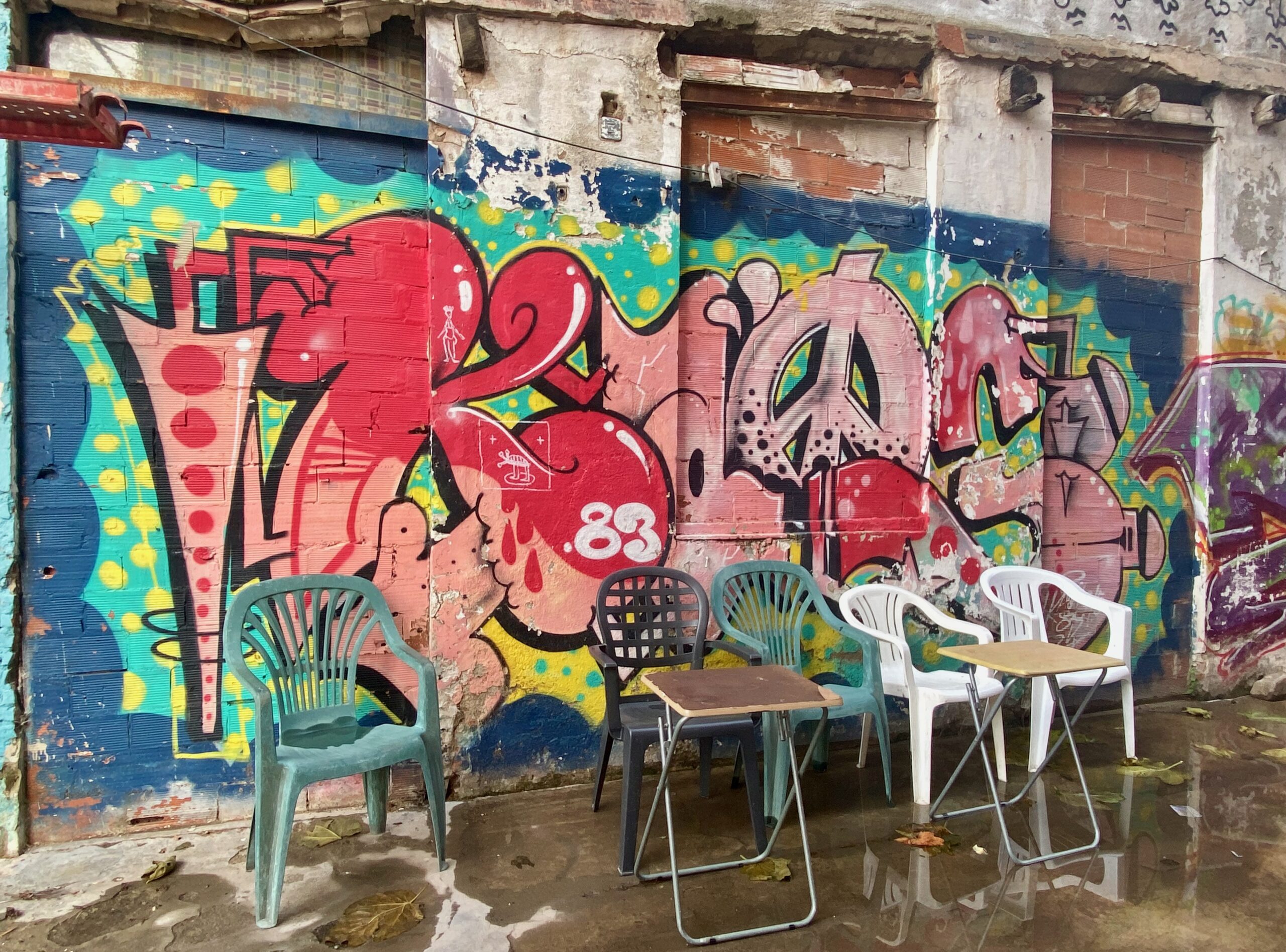 Ici, comme ailleurs dans Poblenou, le contraste est permanent. En face de la galerie c’est une palissade de Graffitis qui vient souligner un mur représentant une ancienne colonne grecque.