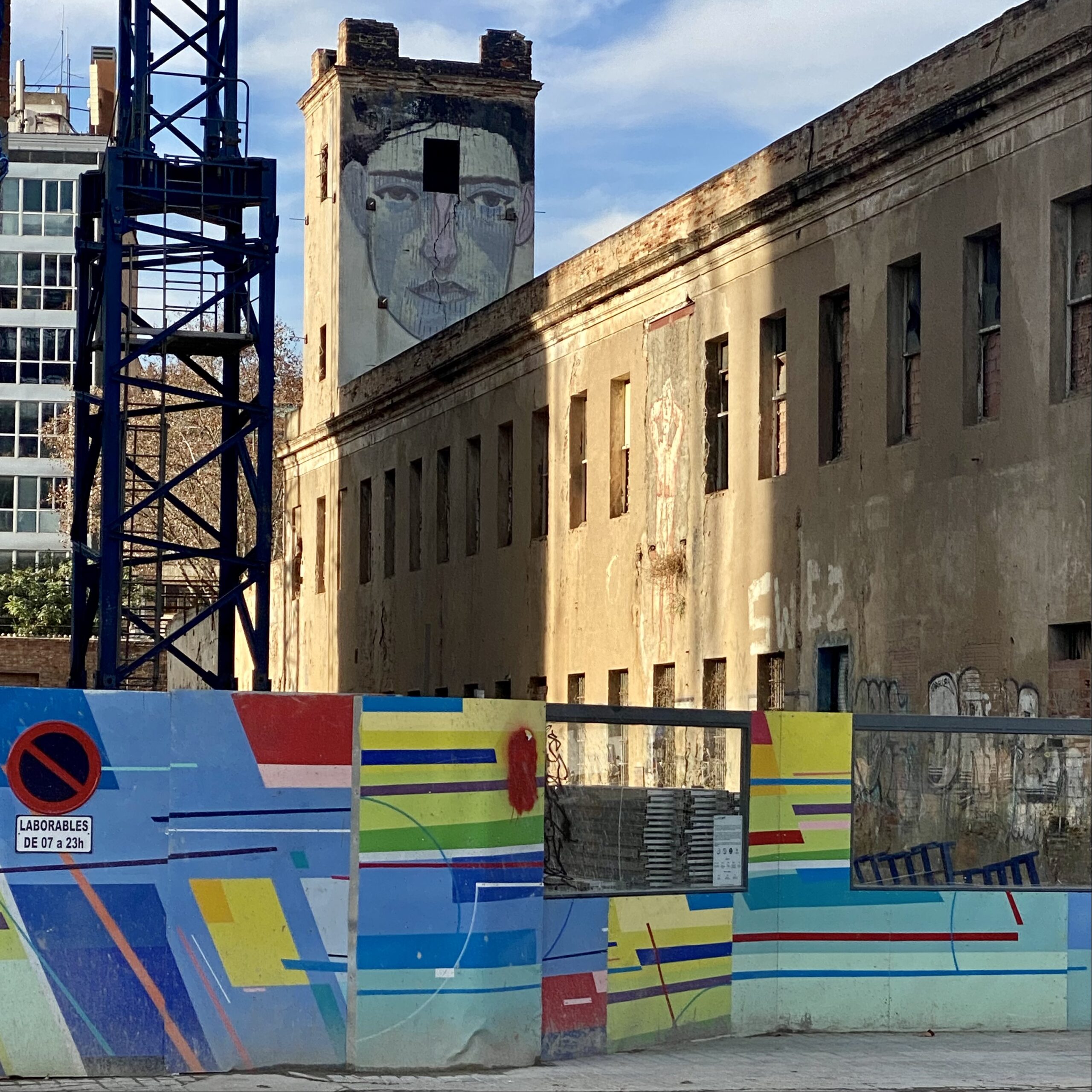 En me rendant Carrer de l’Agricultura je commence à réellement me rendre compte que le quartier n’en es pas au début de sa mutation. De certaines usines il ne reste plus que la cheminée qui servira certainement d’élément de décoration au milieu des monstres de verres qui se construisent.