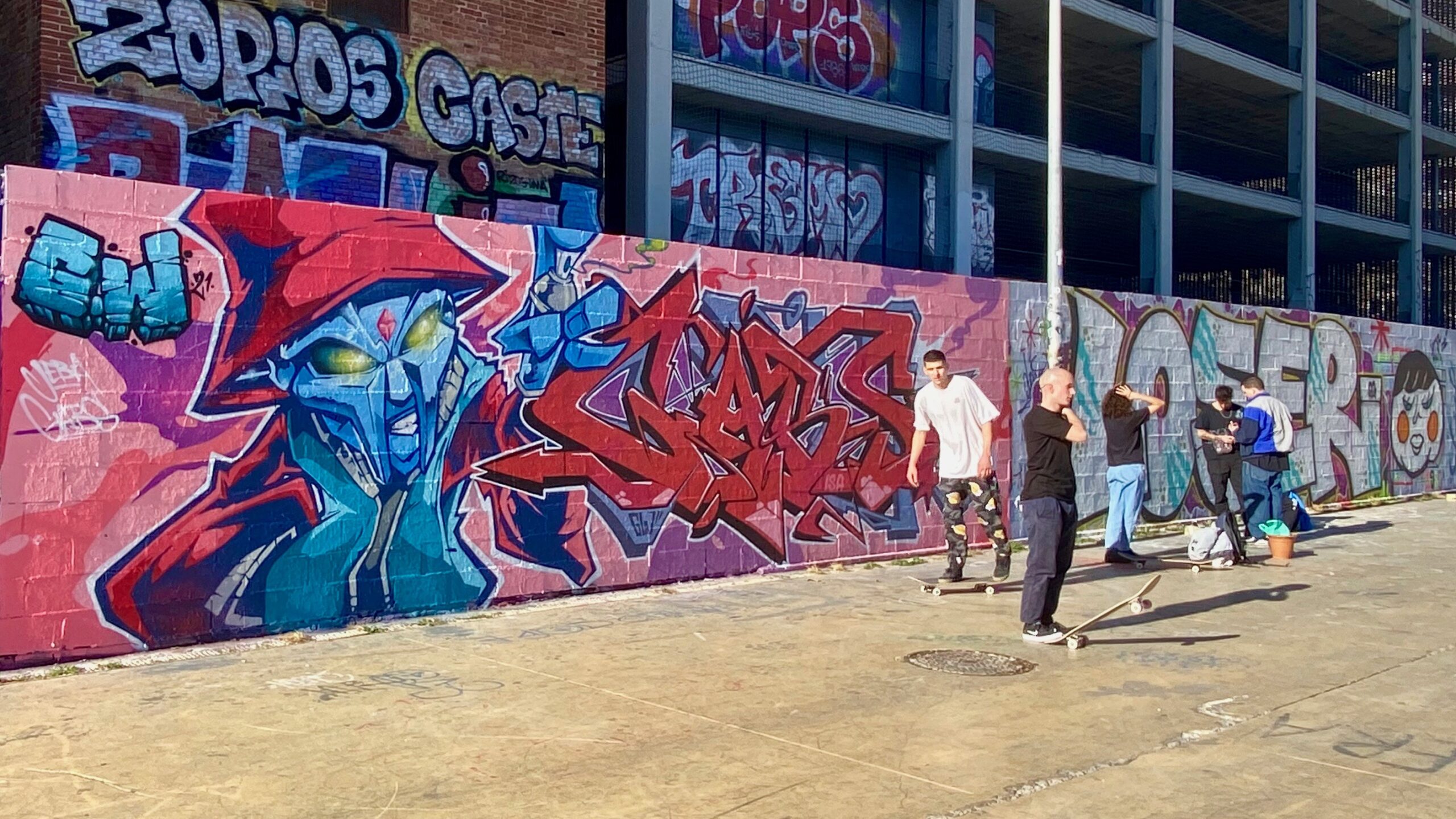 Difficile de se concentrer sur un mur en particulier tellement la cacophonie des couleurs et la densité des graffs vous sautent au visage. Après une bonne respiration, je décide de longer mur après mur en prenant soin d’éviter skateurs fous et danseurs en tous genres. Je reconnais très vite quelques graffs de PEZ, et me perd dans les centaines de Blazes qui couvrent toutes les stylistiques du graff : block buster, bubble, old, wild,… Certaines fresques qui ont dû être magnifiques sont recouvertes par d’autres et il y a même des Street Artistes qui se prennent pour Picasso !