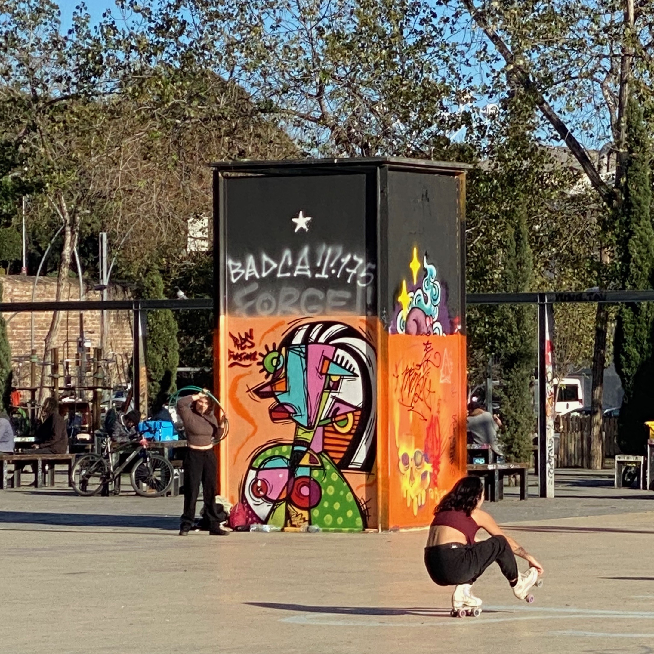 En fait je ne sais absolument pas pourquoi le lieu se prénomme « Jardin » ! Les trois cheminées sont les vestiges de l’ancienne centrale électrique La Canadenca, un fleuron de l’industrie Espagnole. On arrive sur une esplanade complètement bétonnée dont la pente ravie les skateurs. L’immense étendue permet à chacun d’y révéler son talent et une sorte de Blockhaus trônant en hauteur sert, paraît-il, de podium pour des concerts. En fait on a la sensation d’être dans un no man’s land alors que l’on se trouve au cœur de Barcelone ! L’ambiance est éclectique, voire chaotique et évidemment pas un seul mur n’est pas graffié…