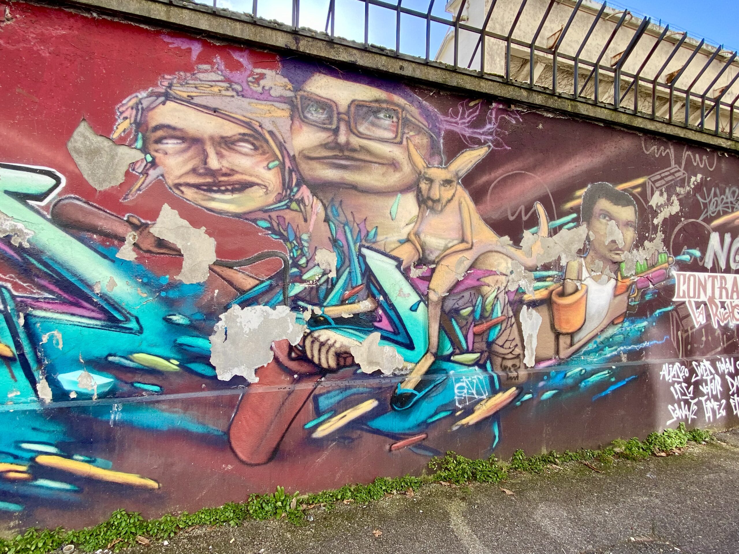 L’œuvre la plus énigmatique, voire abstraite, dans laquelle je retrouve les visages du fameux « hall of fame » a été justement réalisée par Ekis & Boye deux artistes du Collectif Contratak. Je ne sais pas pourquoi, mais j’ai un petit coup de cœur pour cette œuvre plutôt discrète qui s’intègre parfaitement à l’urbanisation. Une petite marche m’attend pour rejoindre la partie la plus foisonnante d’œuvres de ce fameux cours. Au cours de cette marche les contrastes architecturaux sont parfois saisissants !