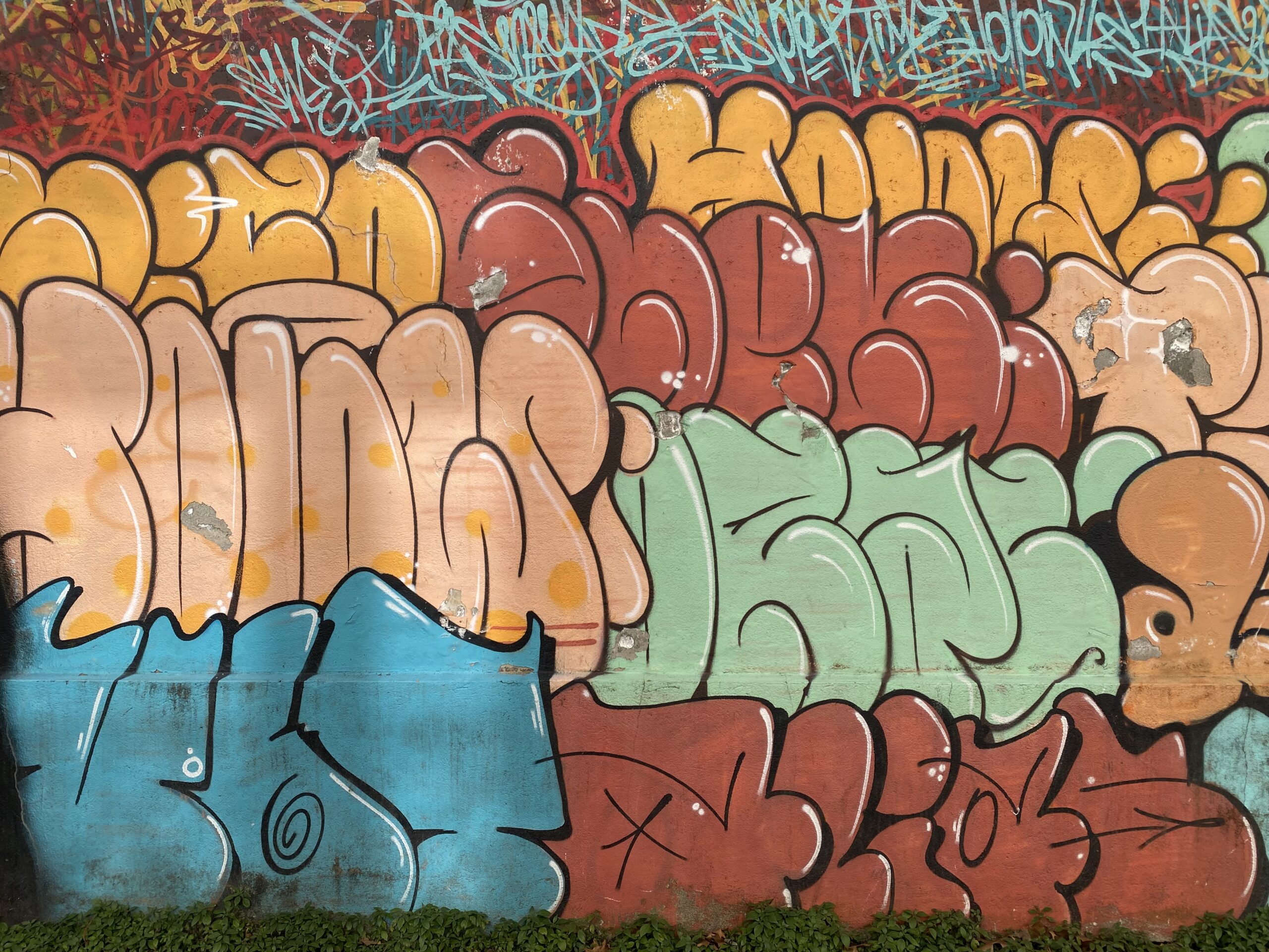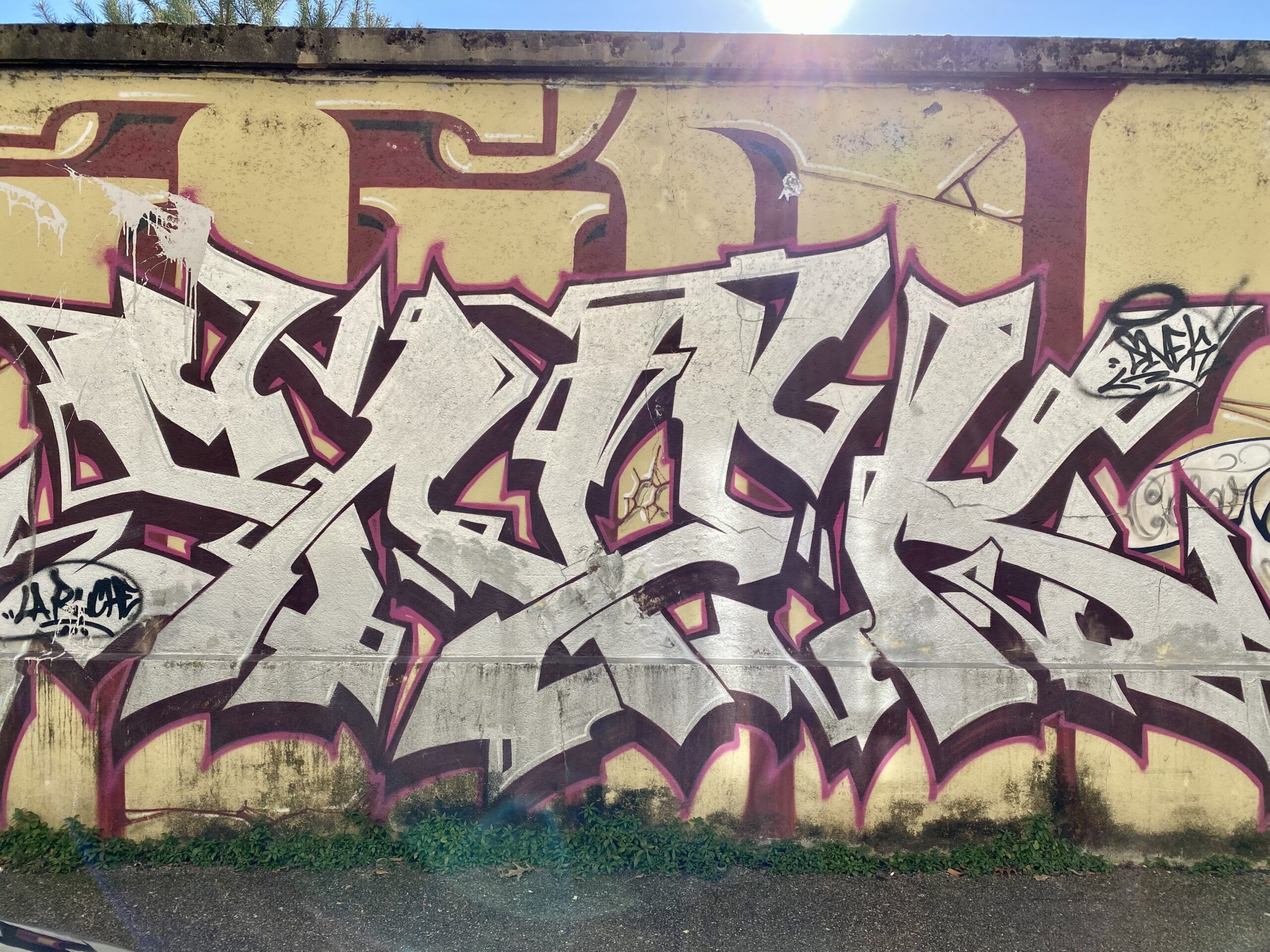 Honnêtement je m’attendais à tout, sauf à ça ! Je n’en reviens pas ! Ce mur immensément long est un feu d’artifices pour mes yeux… je gambade dans tous les sens et je sais déjà que d’excellents Writerz se sont attaqués au béton … Bubble letters, écritures Wild ou Old Style, blazes hyper travaillés, figurines low brow et caractères en tous genres viennent offrir un saisissant spectacle ! Le tout est harmonieux et l’on passe d’un style à l’autre sans rupture violente. Un magnifique travail ! Je ne connais malheureusement pas les graffiteurs de la scène Grenobloise, et cela me frustre un peu… mais je dois avouer qu’après avoir découvert que cette immense « Hall of Fame » est l’œuvre du collectif CONTRATAK, celui-là même qui organise quelques blocks parties mêlant musique, peinture,.. Je comprends que ce Grenoble Street Art Fest n’est pas là pour faire de la décoration. Il fait vibrer la ville !
