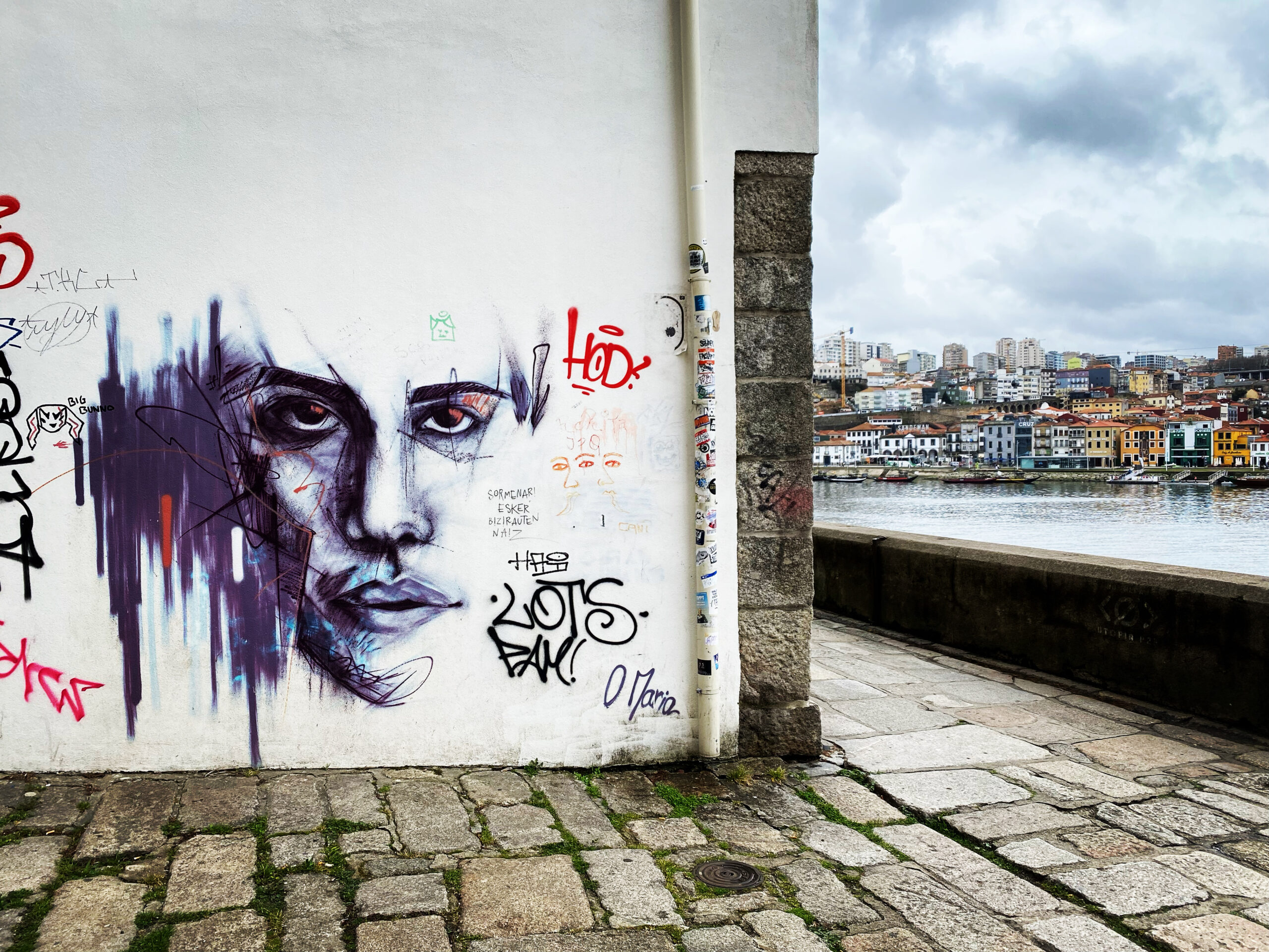 On a tellement l’habitude de voir les grands noms de l’art urbain dans toutes les villes du monde qu’on en oublie parfois d’où viennent les artistes. Et pourtant, afin de réaliser leurs œuvres, ils puisent souvent dans leur vécu et dans la culture du pays qui les a vu grandir. Aussi quand je suis tombée par hasard sur une œuvre de Vhils sur les quais du Douro, je n’étais pas étonnée de découvrir ce visage sculpté au marteau piqueur. Vhils a réalisé beaucoup d’œuvres dans son pays d’origine. Nous avons également la chance d’en avoir beaucoup en France et il fait parti de ces grands noms qui parcourent le monde.