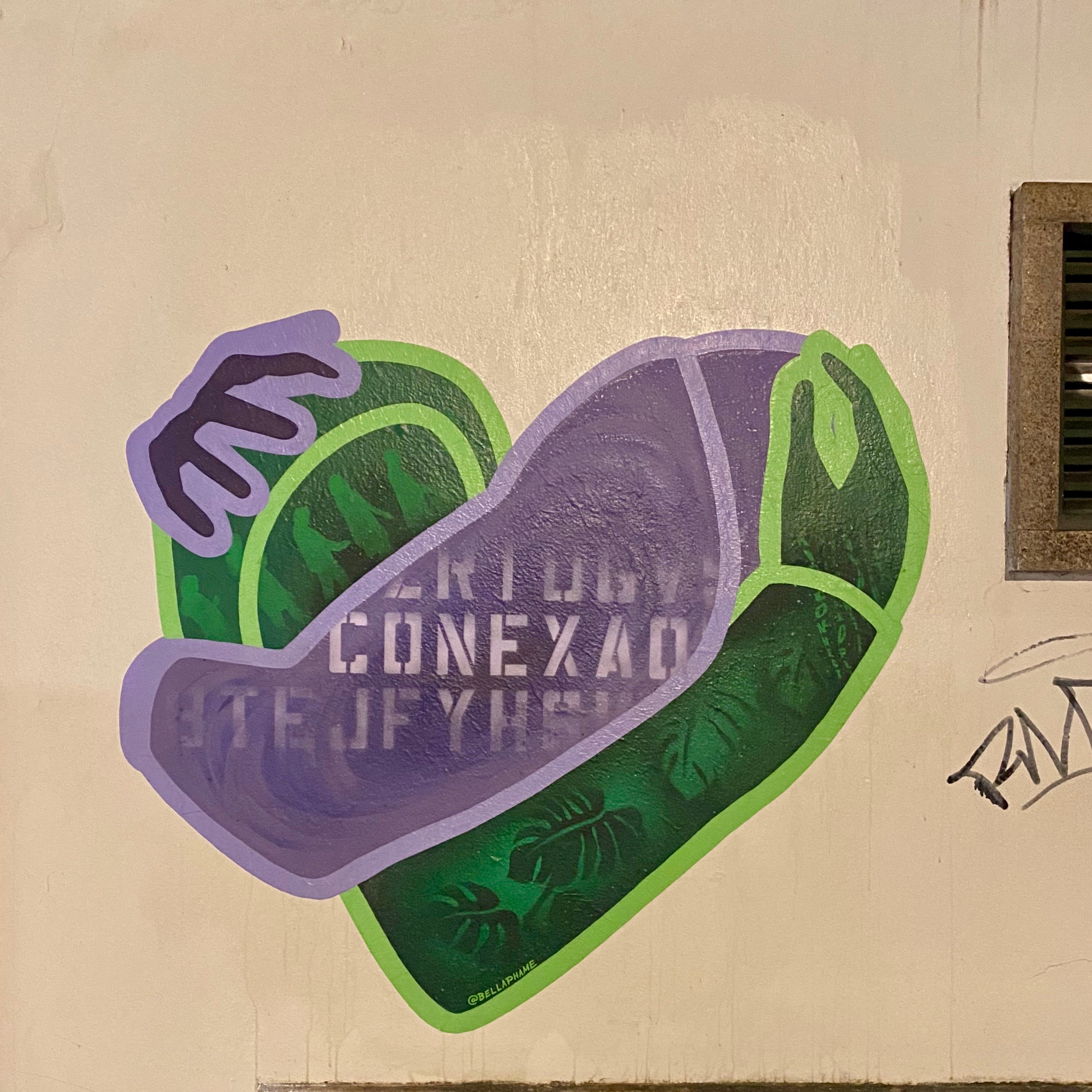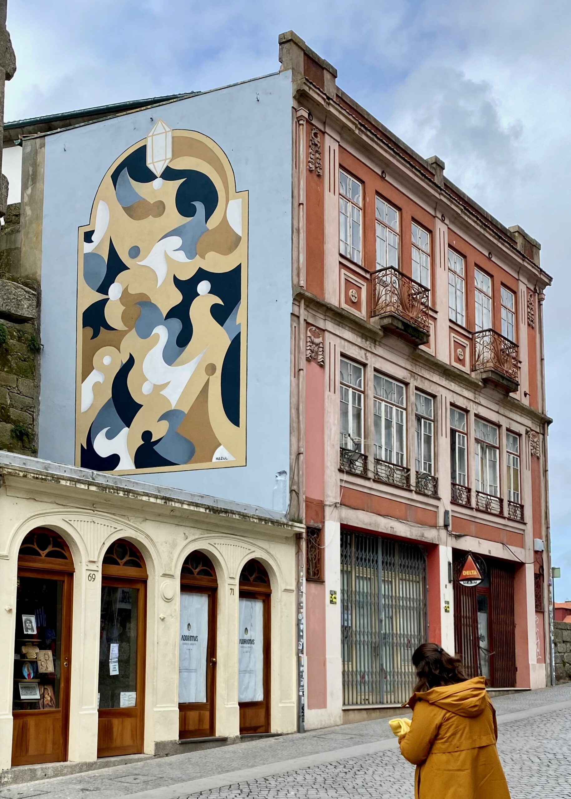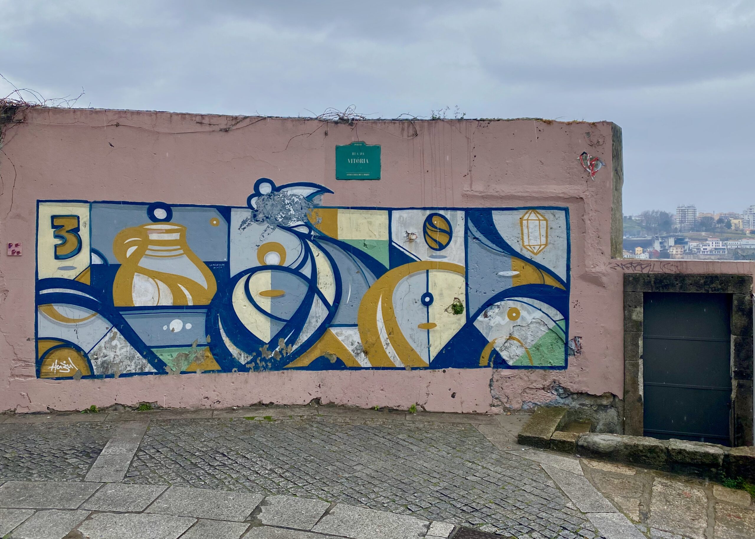 Ses formes géométriques peuvent paraître simplement décoratives, mais au fur et à mesure des découvertes on trouve dans son travail une dimension onirique et même une symbolique presque religieuse. Cet artiste a posé son propre langage sur les murs de Porto et apporte aux déambulations une dimension mystique ! Un langage et une palette de couleurs que l’on pourrait attribuer à un peuple ancestral. Si vous allez à Porto, vous reconnaîtrez ses œuvres d’un simple coup d’œil tellement son identité est forte !