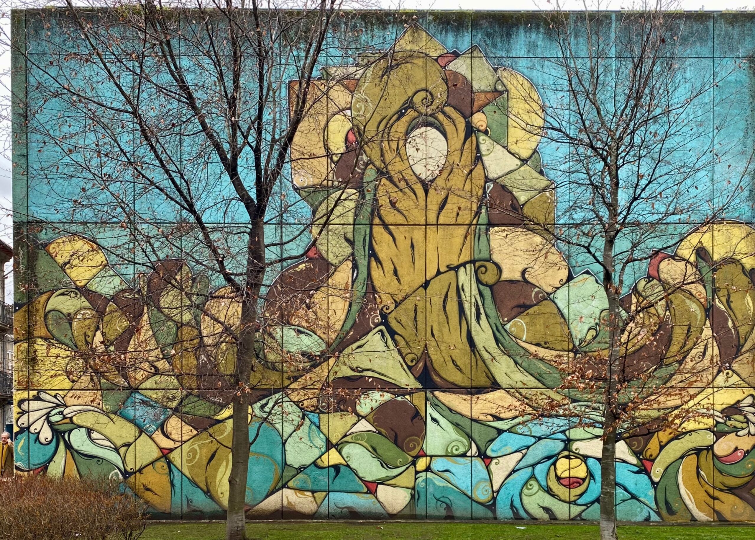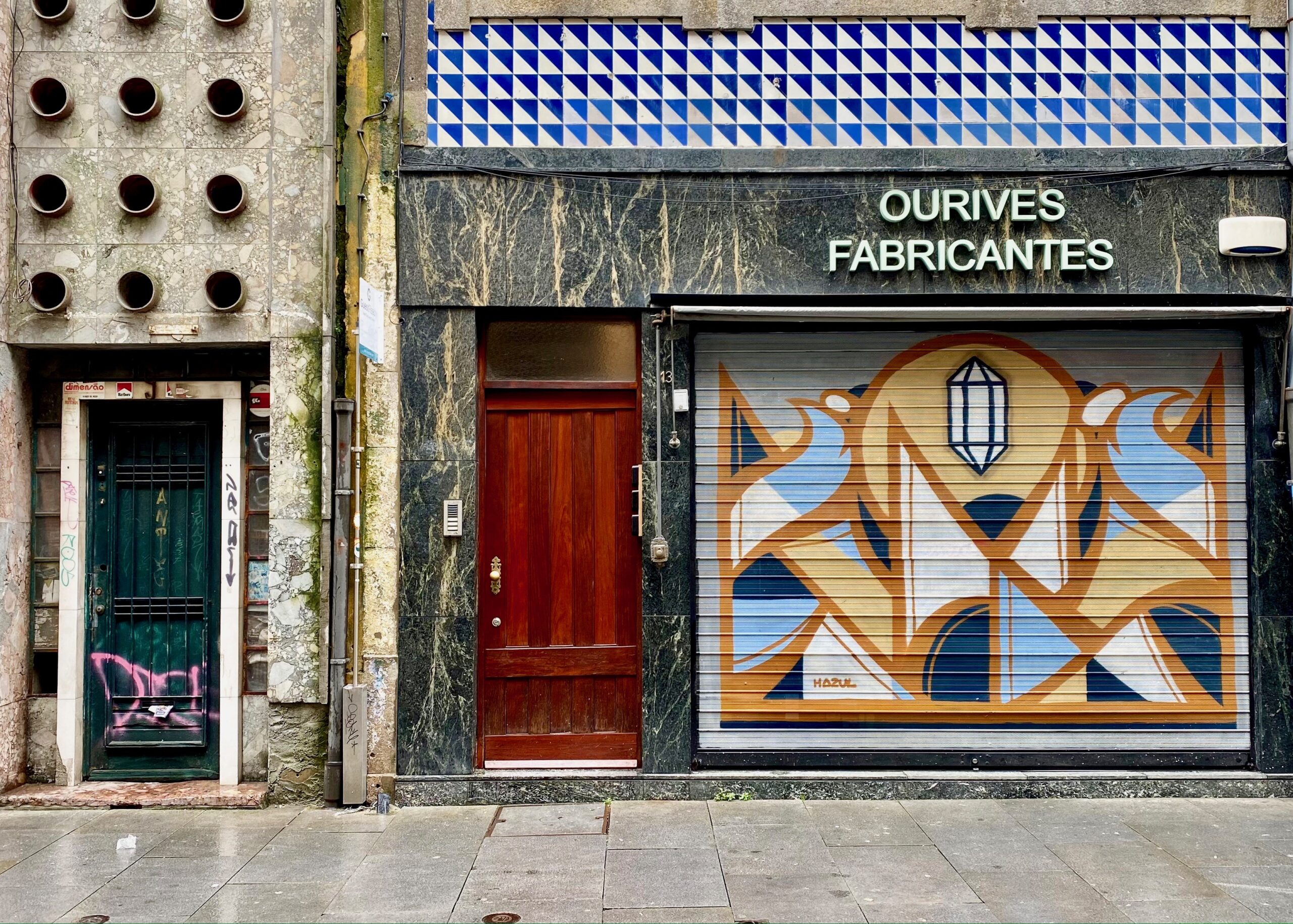 Sincèrement, cet artiste autodidacte a réellement repeint la ville ! Oubliés les Azuleros, les murs sont désormais parés par Hazul ! Il n’y a pas une rue qui n’accueille pas une de ses œuvres. Murs XXL, fresques géométriques en longueurs, porte d’entrées murées,… Tout est Hazul dans cette ville !