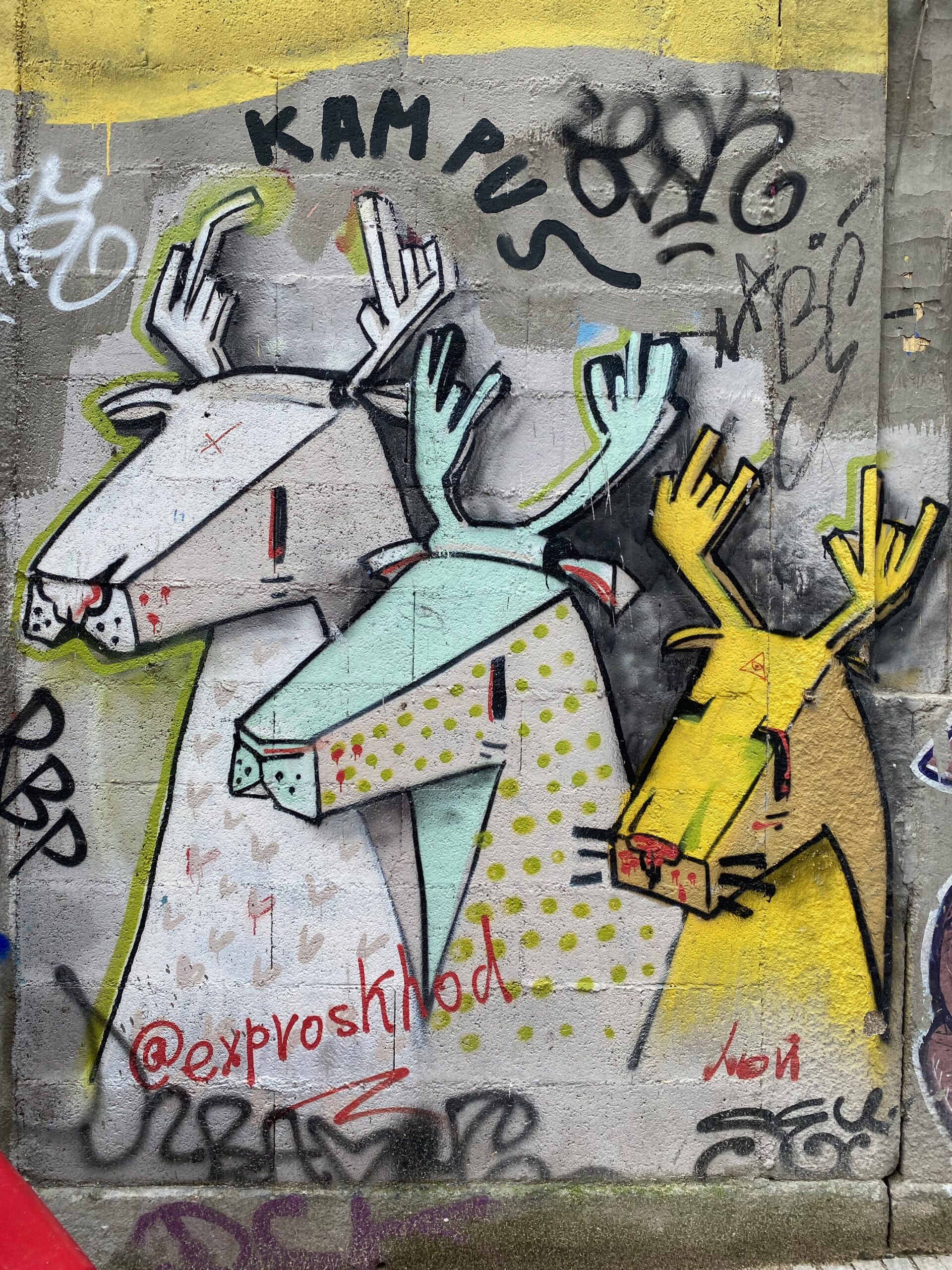 Certaines signatures reviennent souvent, comme celle du graffeur Mesk_85 qui a participé à une fresque géante en l’honneur de Don Quichotte avec Mots & Fedor. On retrouve également le personnage un peu « homme des cavernes » de The caver, les Blazes de la Crew Pixo Not Dead,… et bien d’autres signatures que je ne peux reconnaître ! Je vous ai fait un petit pêle-mêle qui devrait vous donner une idée de tout ce que vous pouvez découvrir et bien sûr dans lequel j’ai intégré le très connu chat bleu de l’artiste Espagnol Liqen.